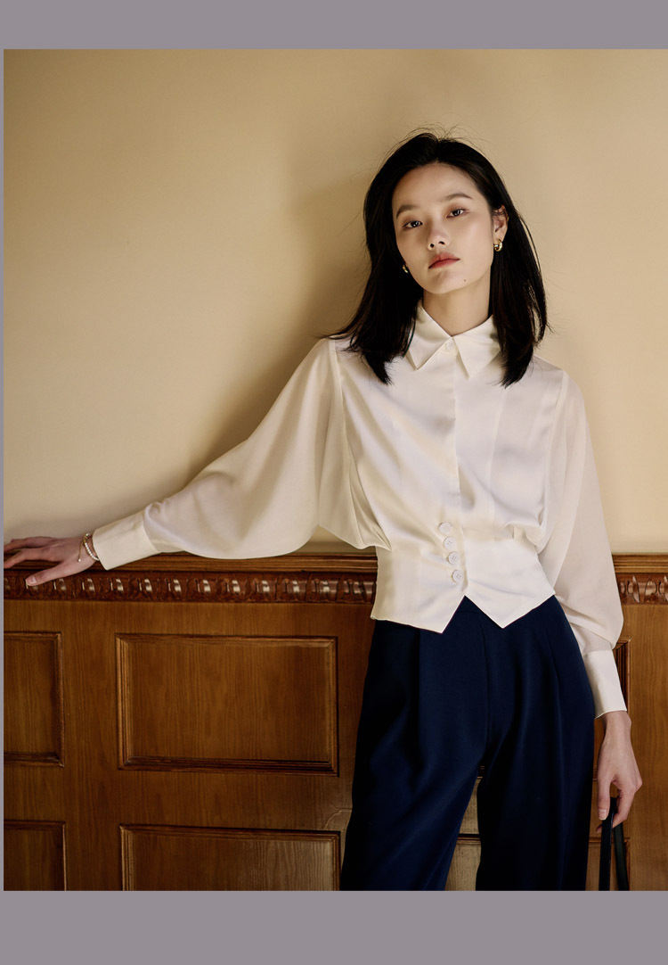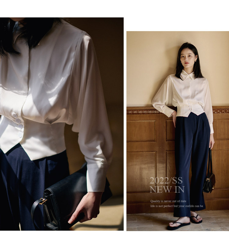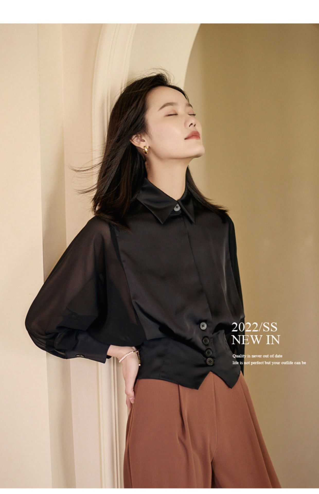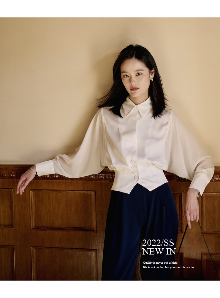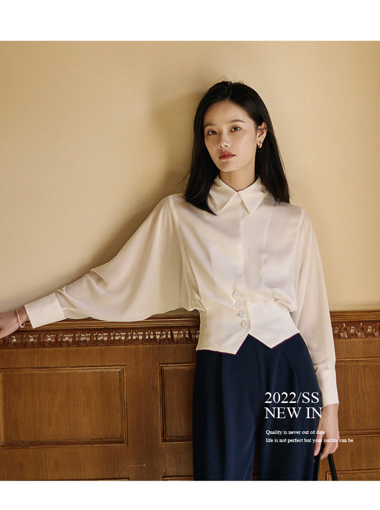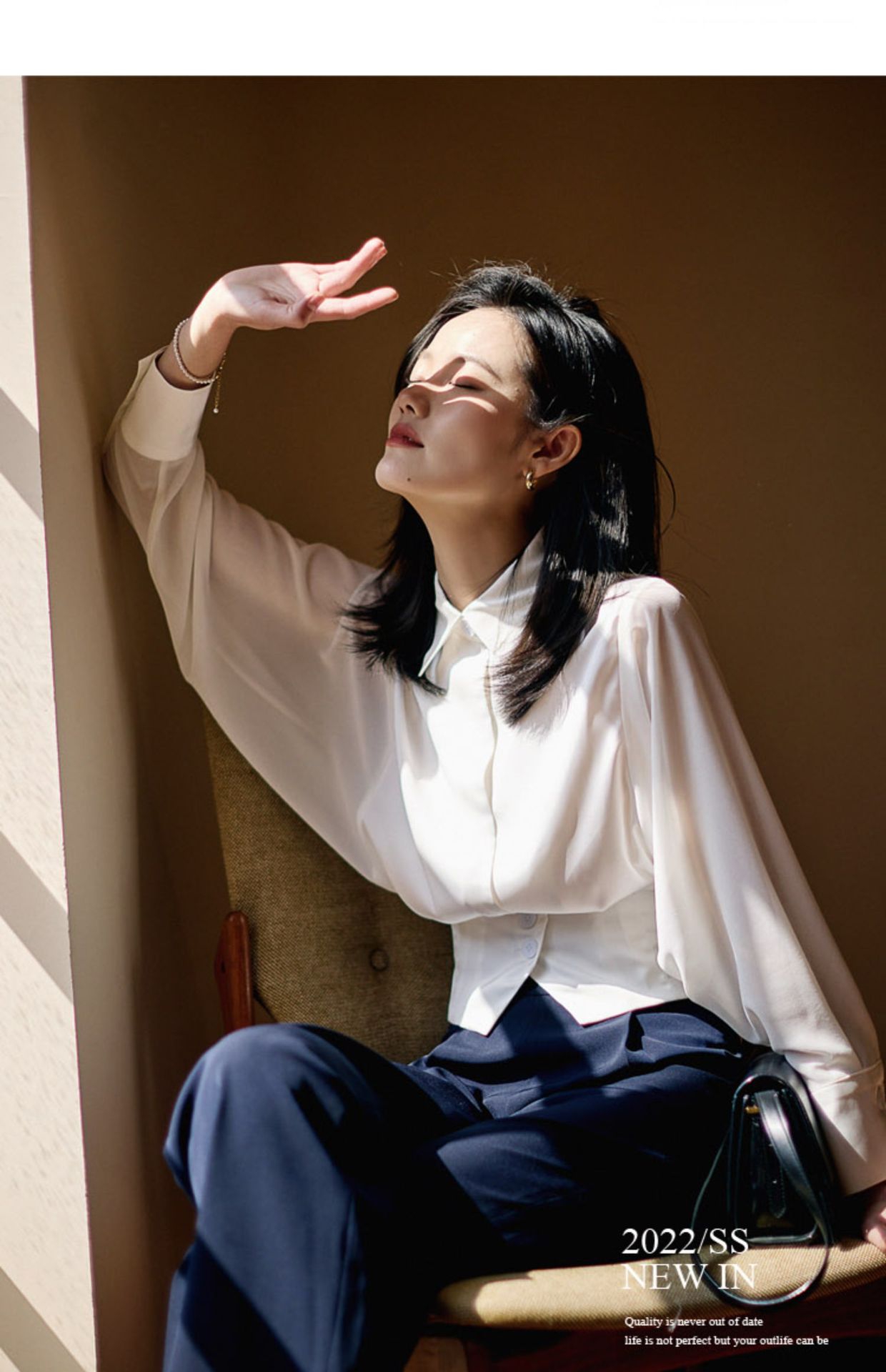 얇고 가벼운 여성용 셔츠, 한국식 디자인, 배트 슬리브, 틈새 라펠 셔츠, 루즈한 허리 슬리밍 셔츠