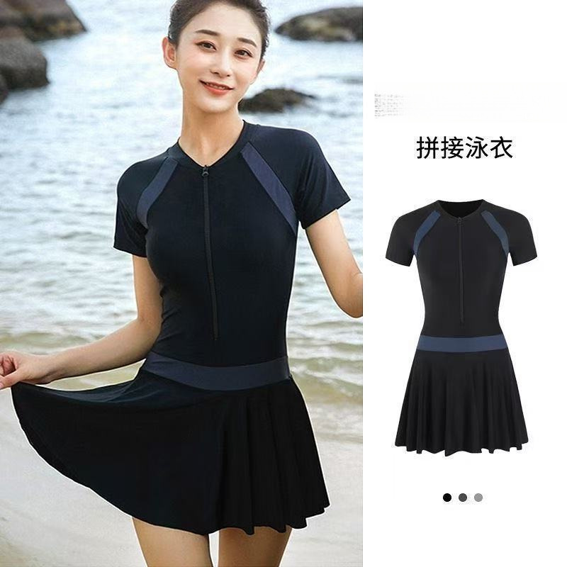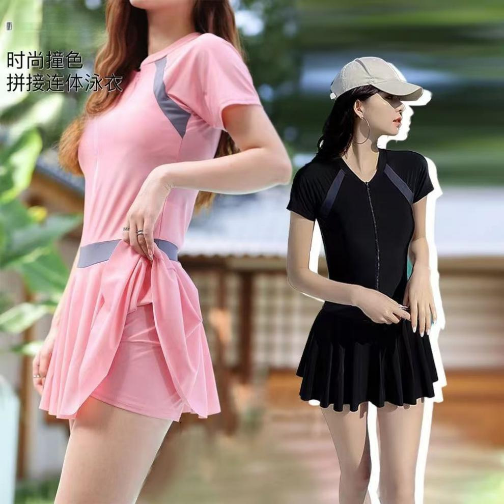 가슴 패드가 있는 여름 지퍼 수영복, 여성용 비치 수영복, 대비 색상, 슬리밍, 노출 방지 스커트 스타일 스포츠 슬림 수영복스토어 가기
