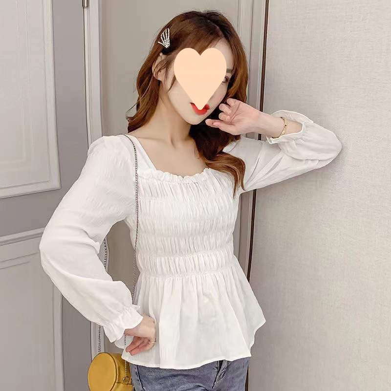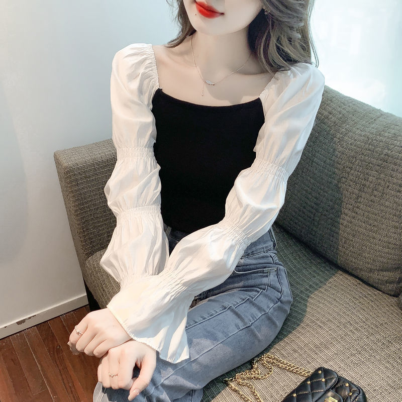 2025 새로운 가을 스타일 달콤한 한국 스타일 스플 라이스 쉬폰 셔츠 퍼프 슬리브 짧은 슬림 피트 셔츠 스웨터 탑스토어 가기