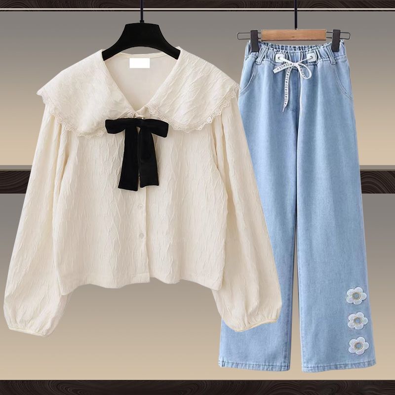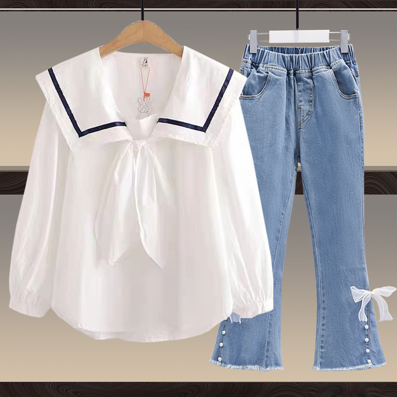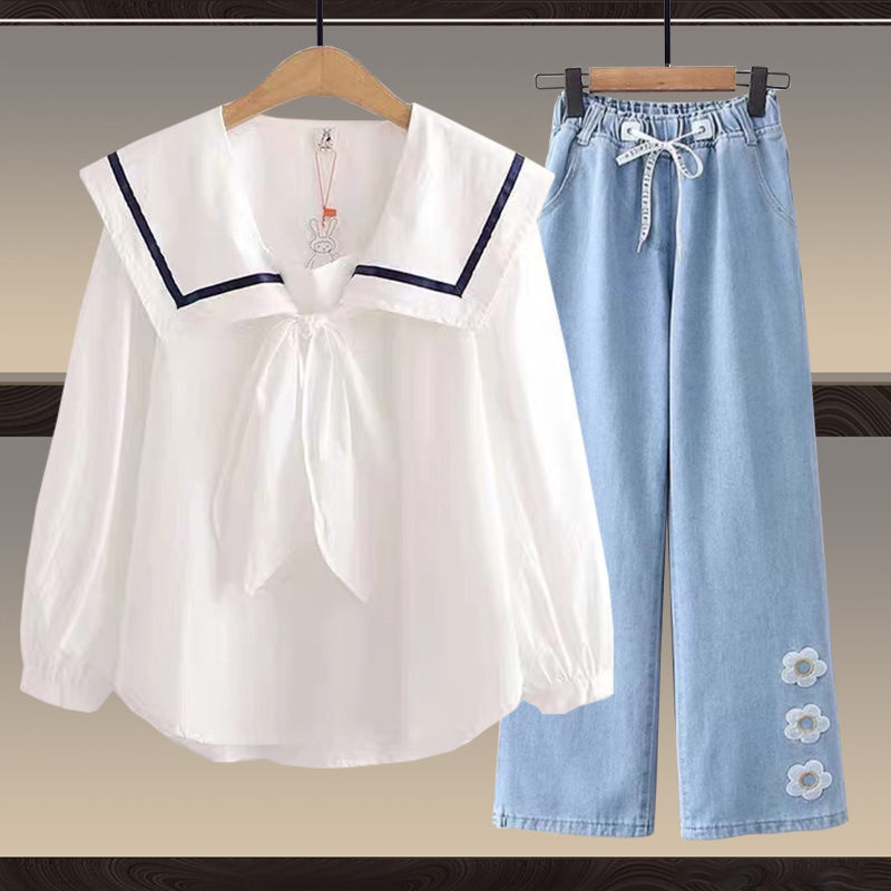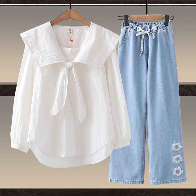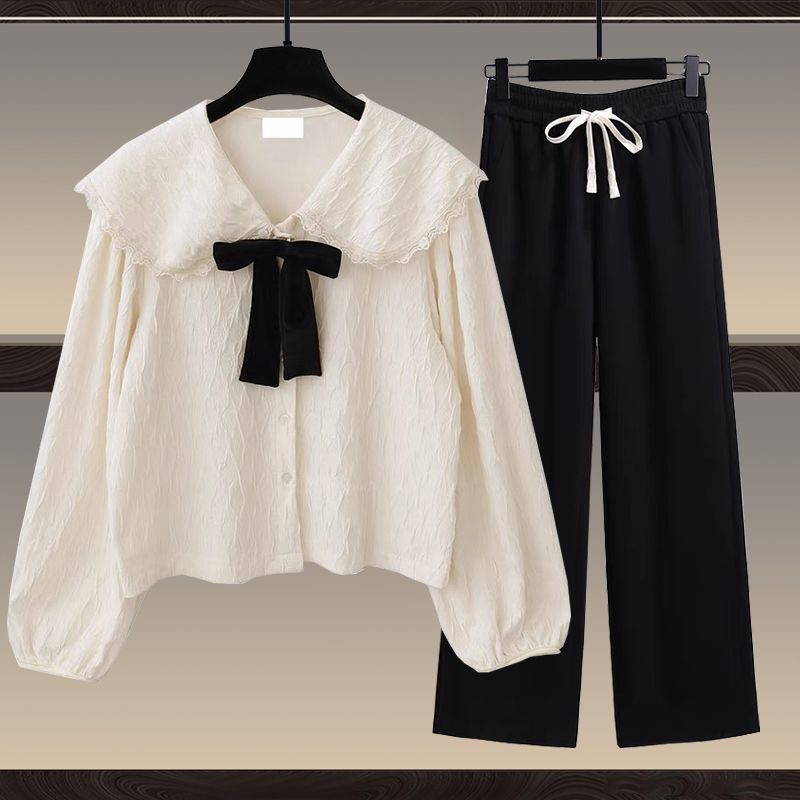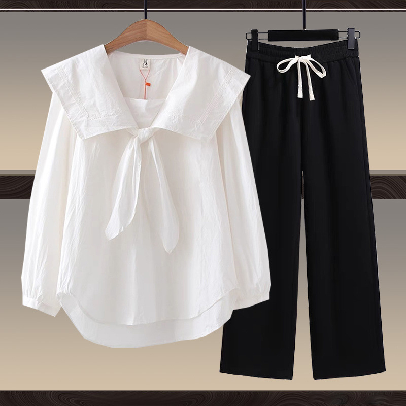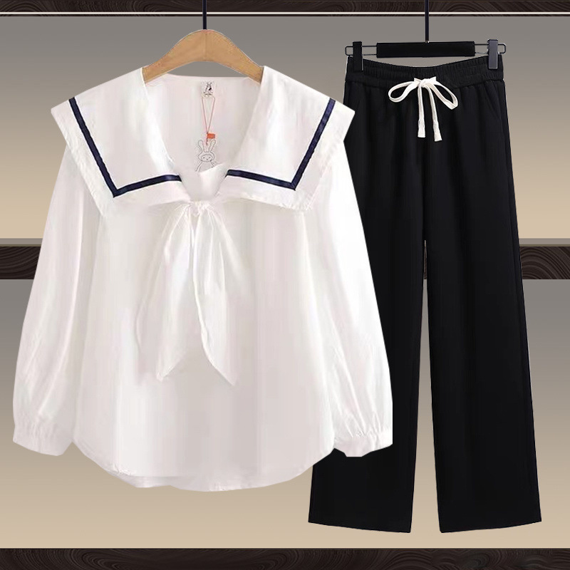 여아 정장 네이비 칼라 쉬폰 셔츠 긴팔 2025 봄, 가을 학생 스위트 탑 와이드 레그 팬츠 투피스 싱글/세트스토어 가기