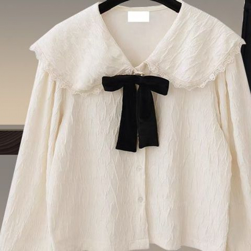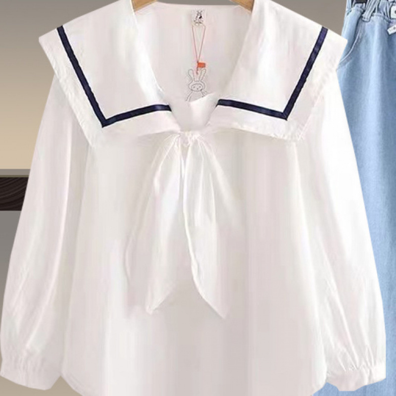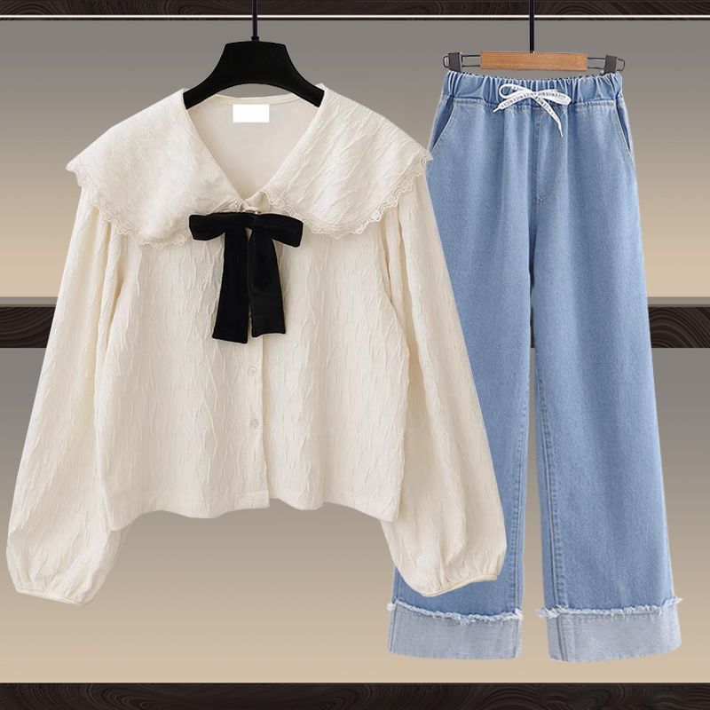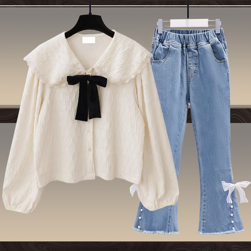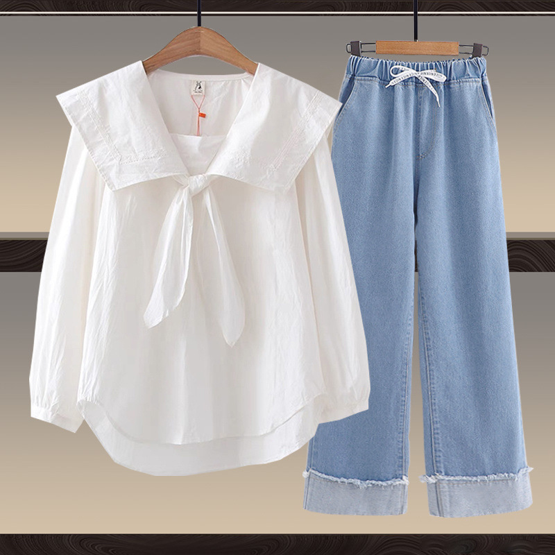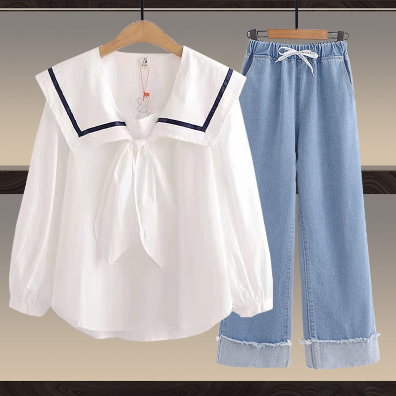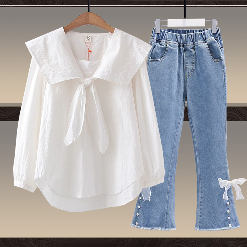 여아 정장 네이비 칼라 쉬폰 셔츠 긴팔 2025 봄, 가을 학생 스위트 탑 와이드 레그 팬츠 투피스 싱글/세트스토어 가기