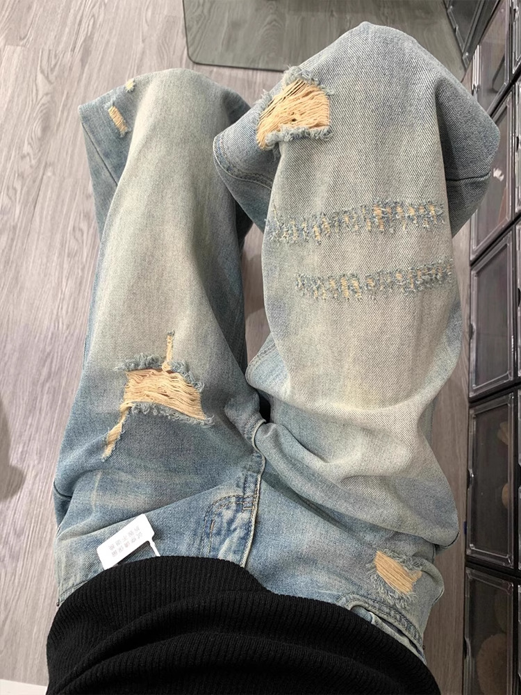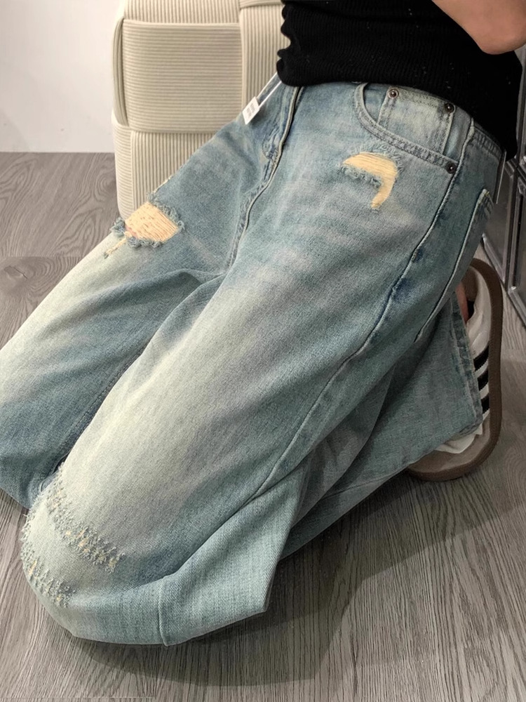 여름 여성을 위한 아메리칸 레트로 하이 스트리트 찢어진 청바지 새로운 디자인 하이 웨이스트 슬리밍 드레이프 바닥 길이 와이드 팬츠스토어 가기