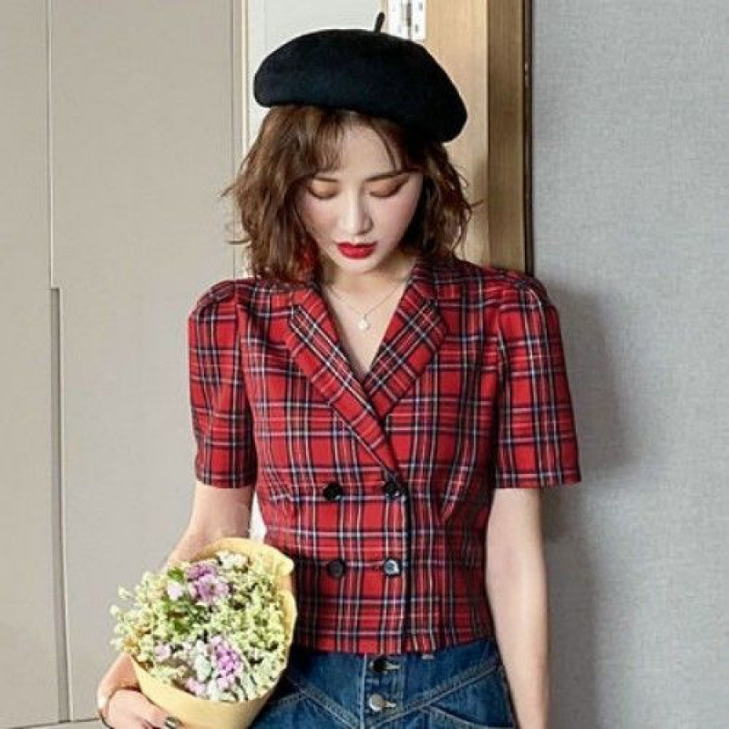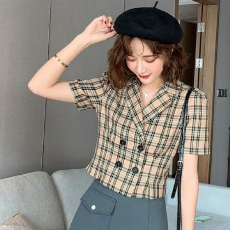 2025 새로운 여름 복고풍 격자 무늬 탑 여성의 새로운 여름 짧은 칼라 허리 다목적 쉬폰 셔츠스토어 가기