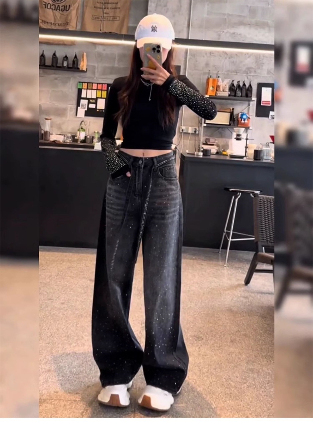 여성용 플러스 사이즈 레이스 업 다이아몬드 청바지 2025 뚱뚱한 소녀를위한 새로운 대형 스타일 슬리밍 스트레이트 와이드 레그 롱 팬츠스토어 가기