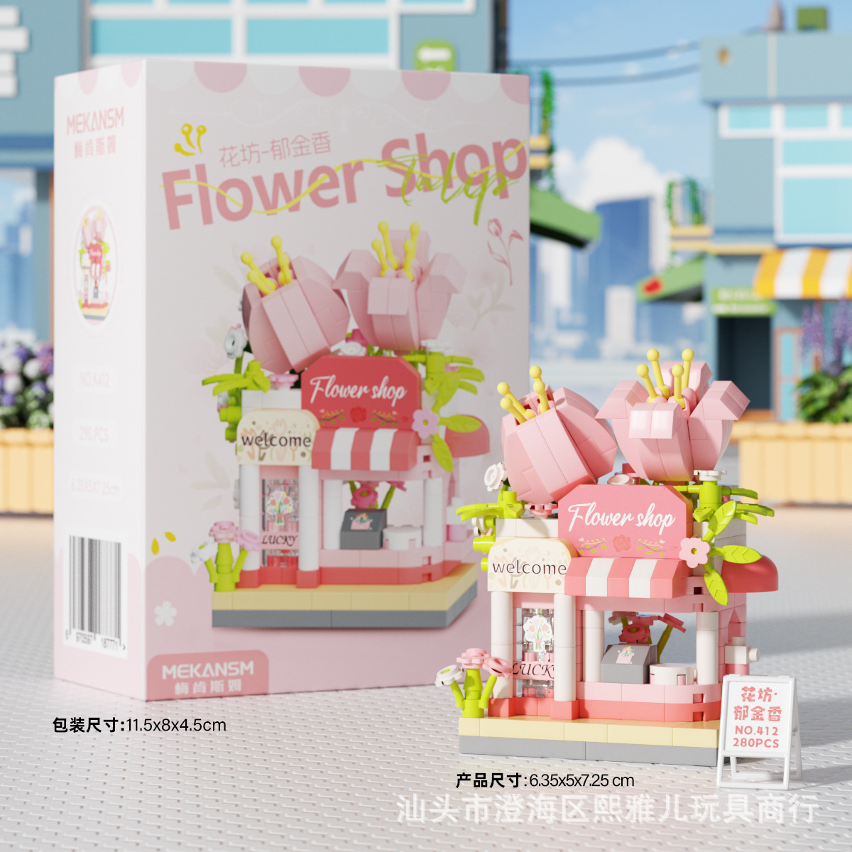 Mekensim 시뮬레이션 장미 해바라기 꽃 가게 어린이 교육 조립 스트리트 뷰 장식품 마이크로 입자 빌딩 블록 장난감스토어 가기