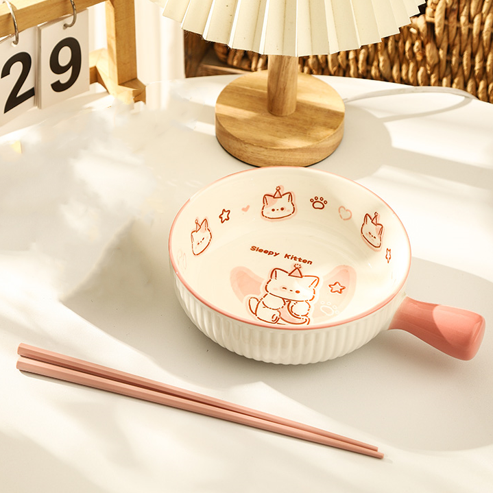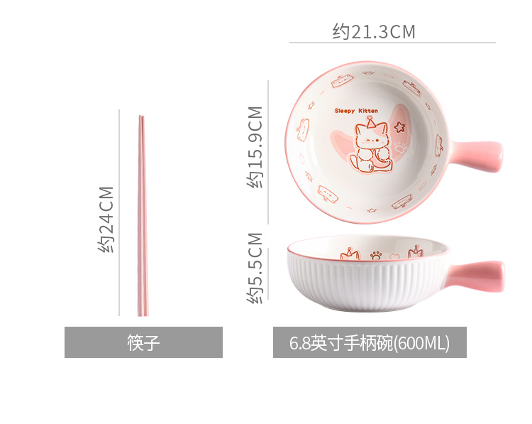 • ✷♀♀◎◎✷졸린 아기고양이 [2종 세트] 손잡이 국수그릇 + 핑크젓가락✷♀♀◎◎✷