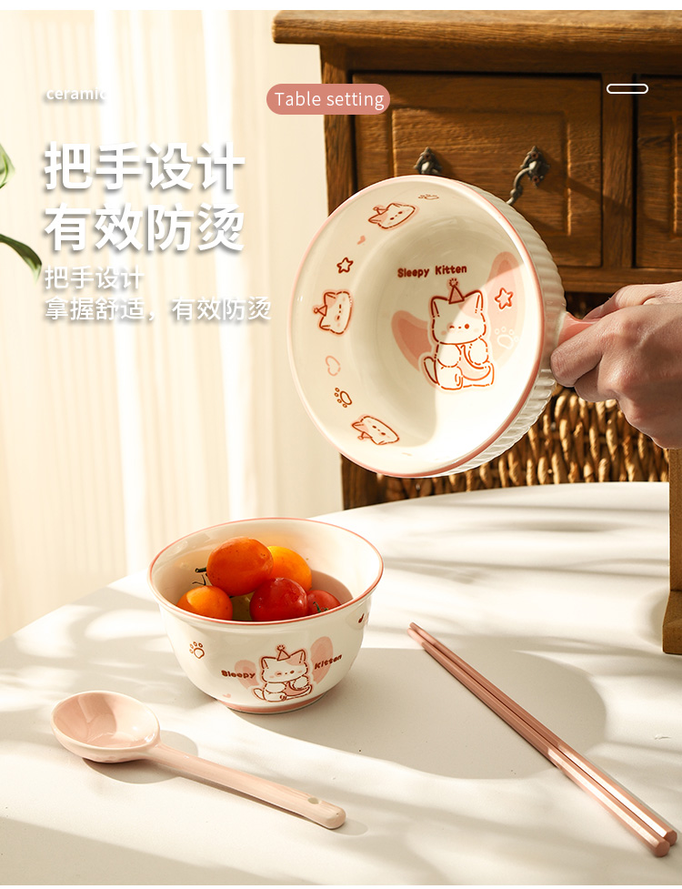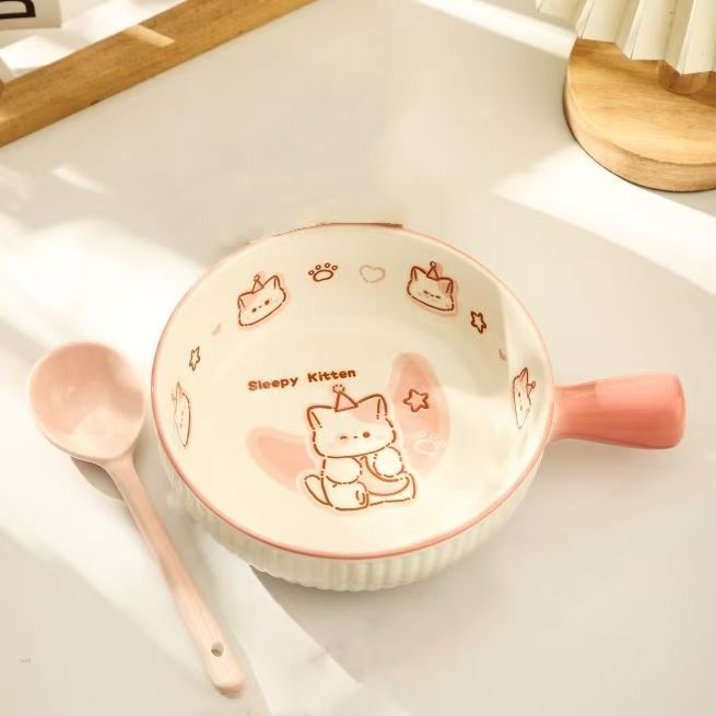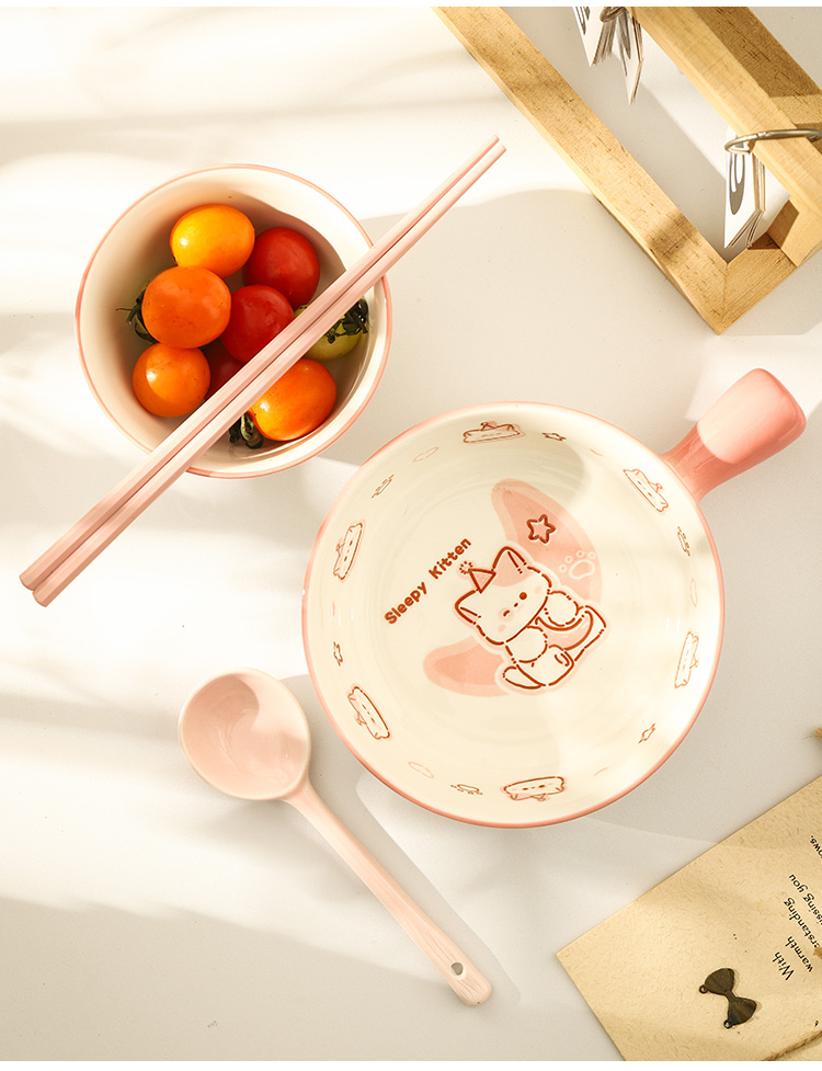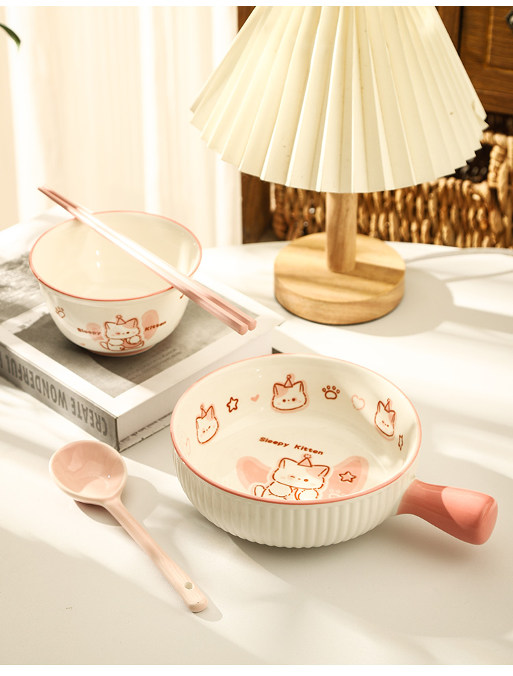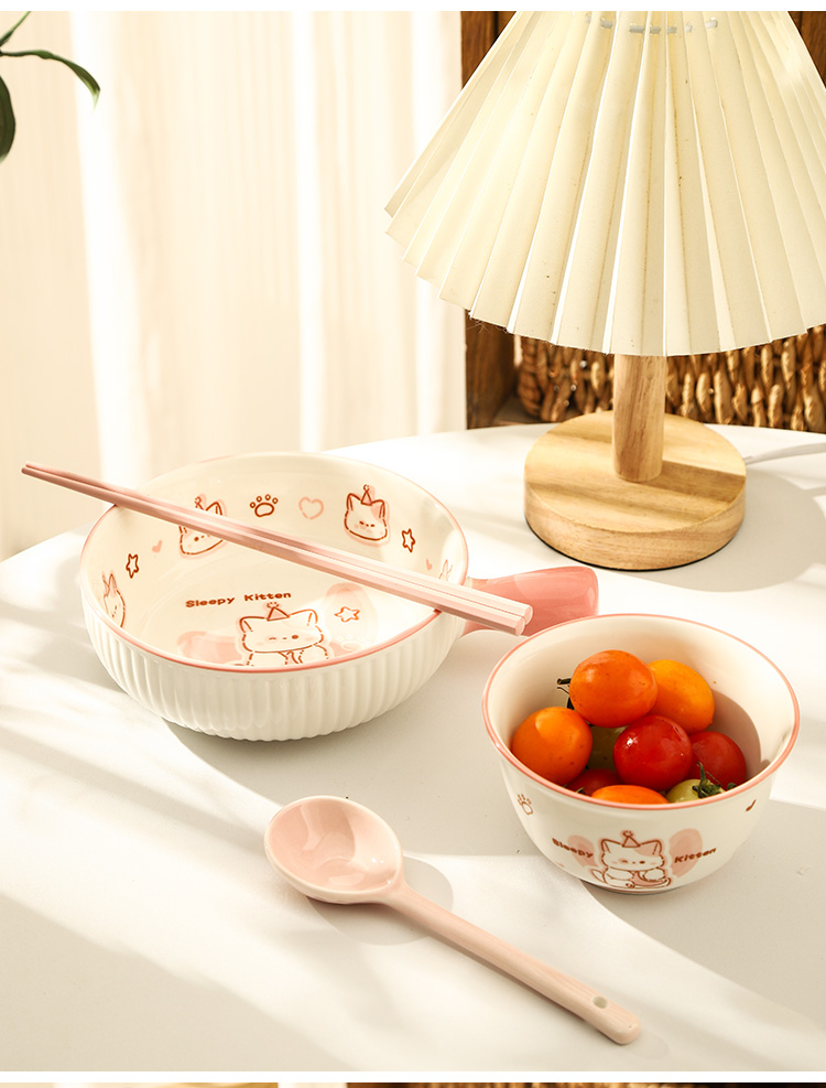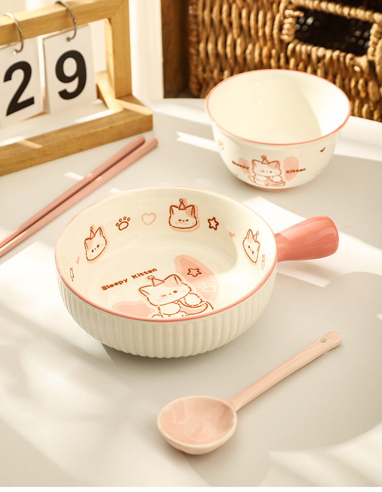 • ✷♀♀◎◎✷졸린 아기고양이 [3종 세트] 손잡이 국수 그릇 + 국그릇 + 국수 스푼✷♀♀◎◎✷