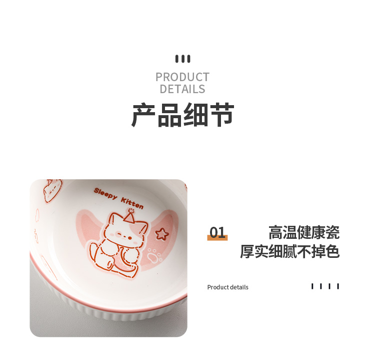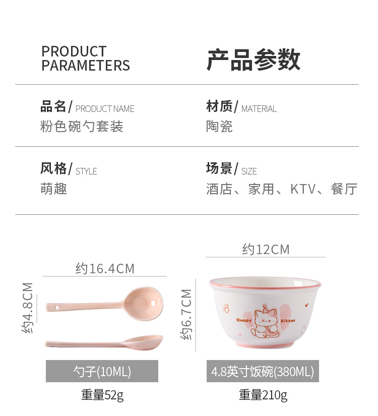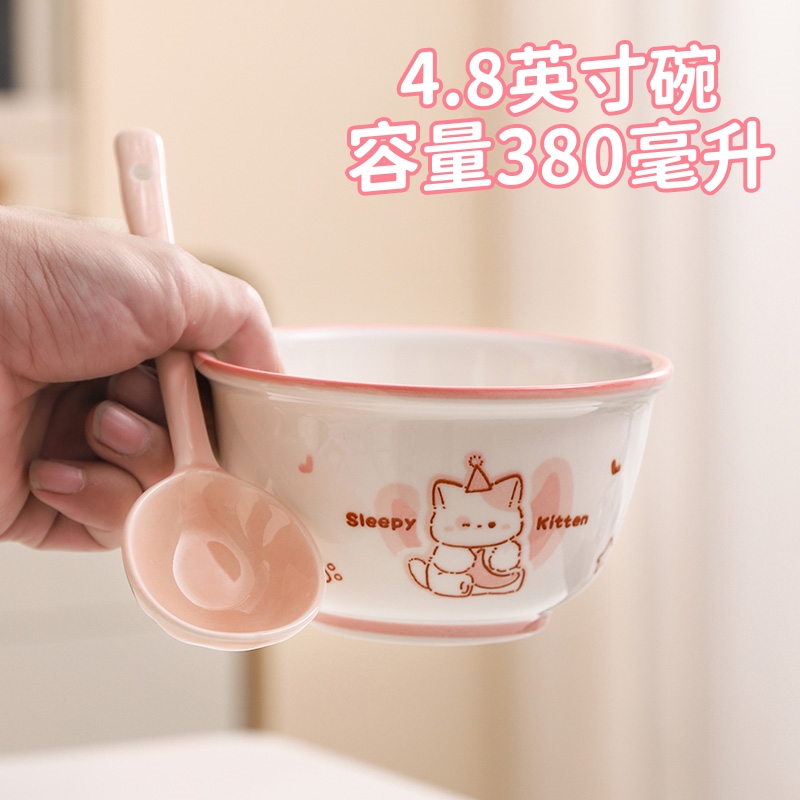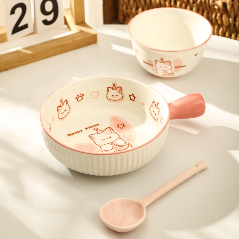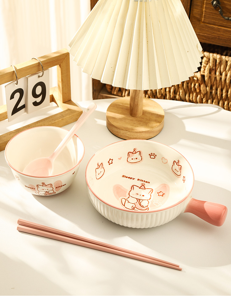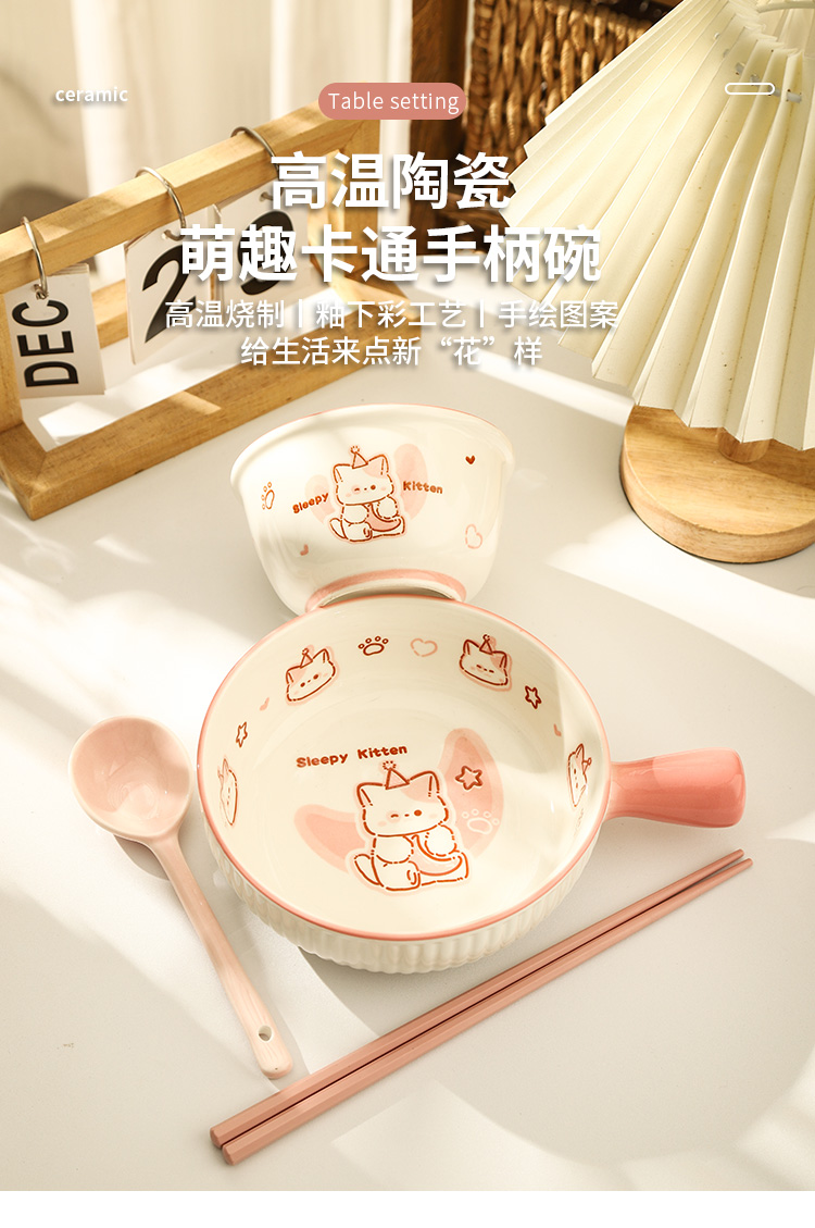 • ✷♀♀◎◎✷졸린 아기고양이 [4종 세트] 손잡이 그릇 + 국그릇 + 복숭아 가루 숟가락 + 가루 젓가락✷♀♀◎◎✷