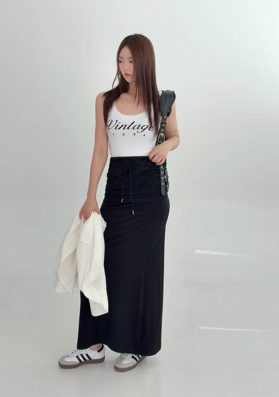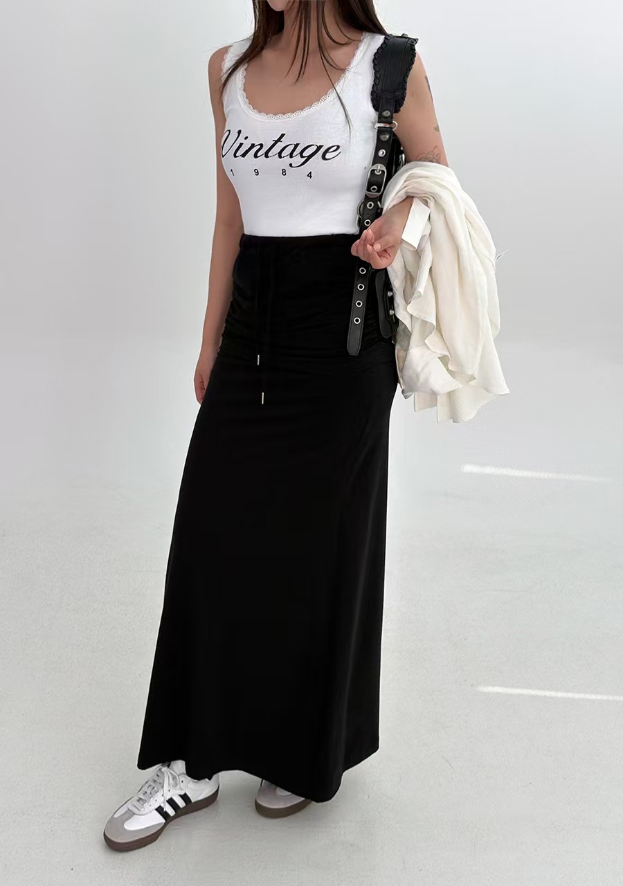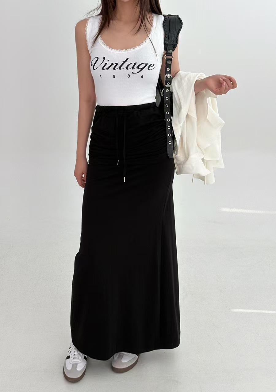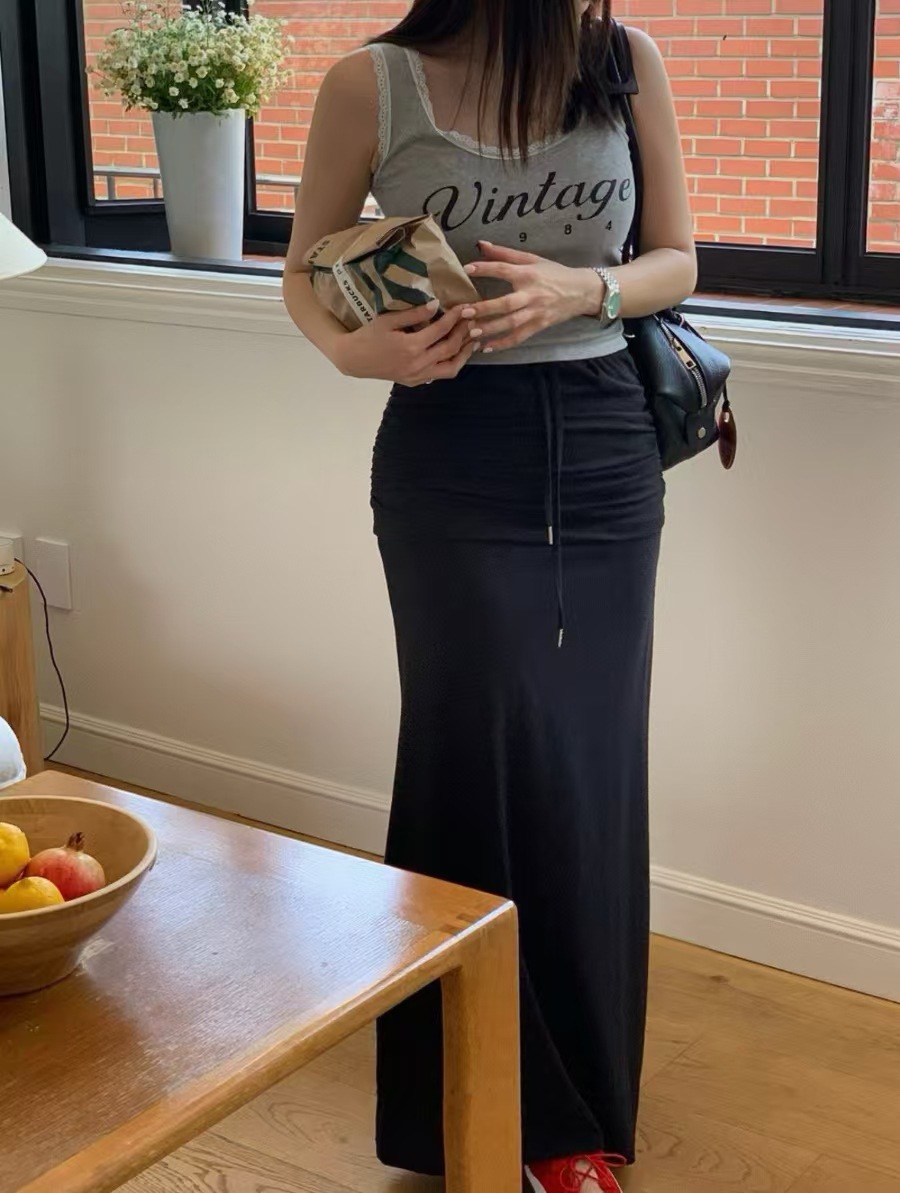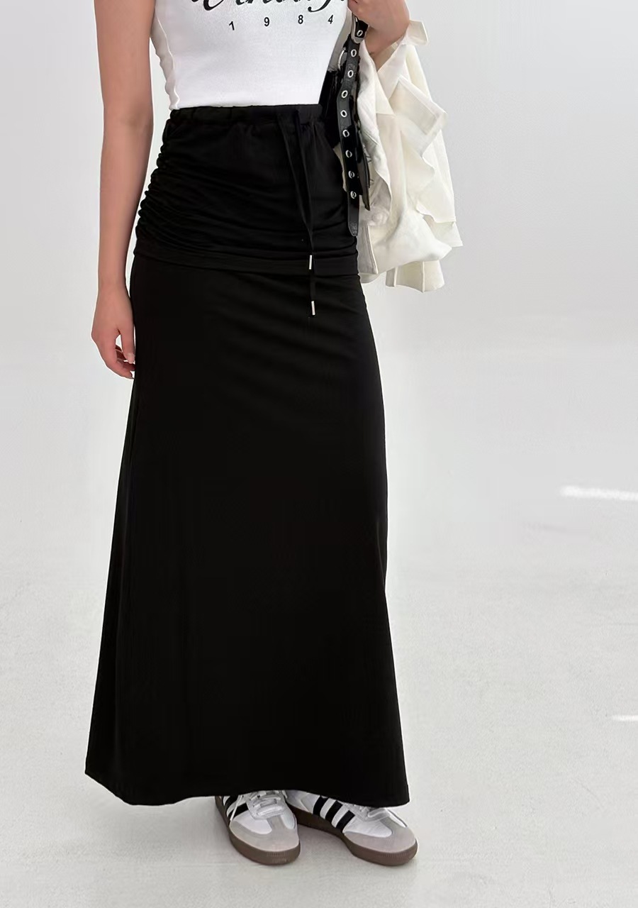 2025년 입하 예정 드로스트링 플리츠 백 슬릿 신축성 있는 허리 하프 기장 힙 스커트