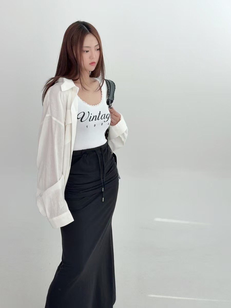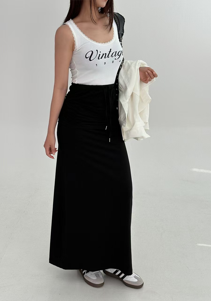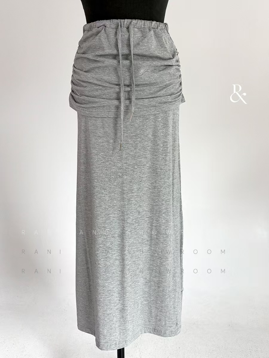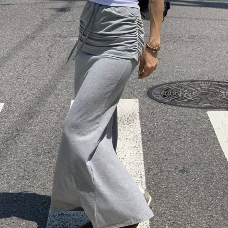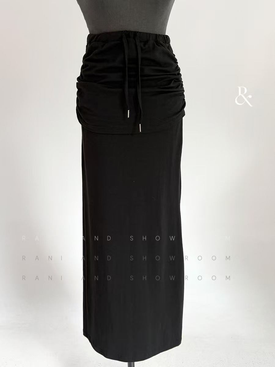2025년 입하 예정 드로스트링 플리츠 백 슬릿 신축성 있는 허리 하프 기장 힙 스커트