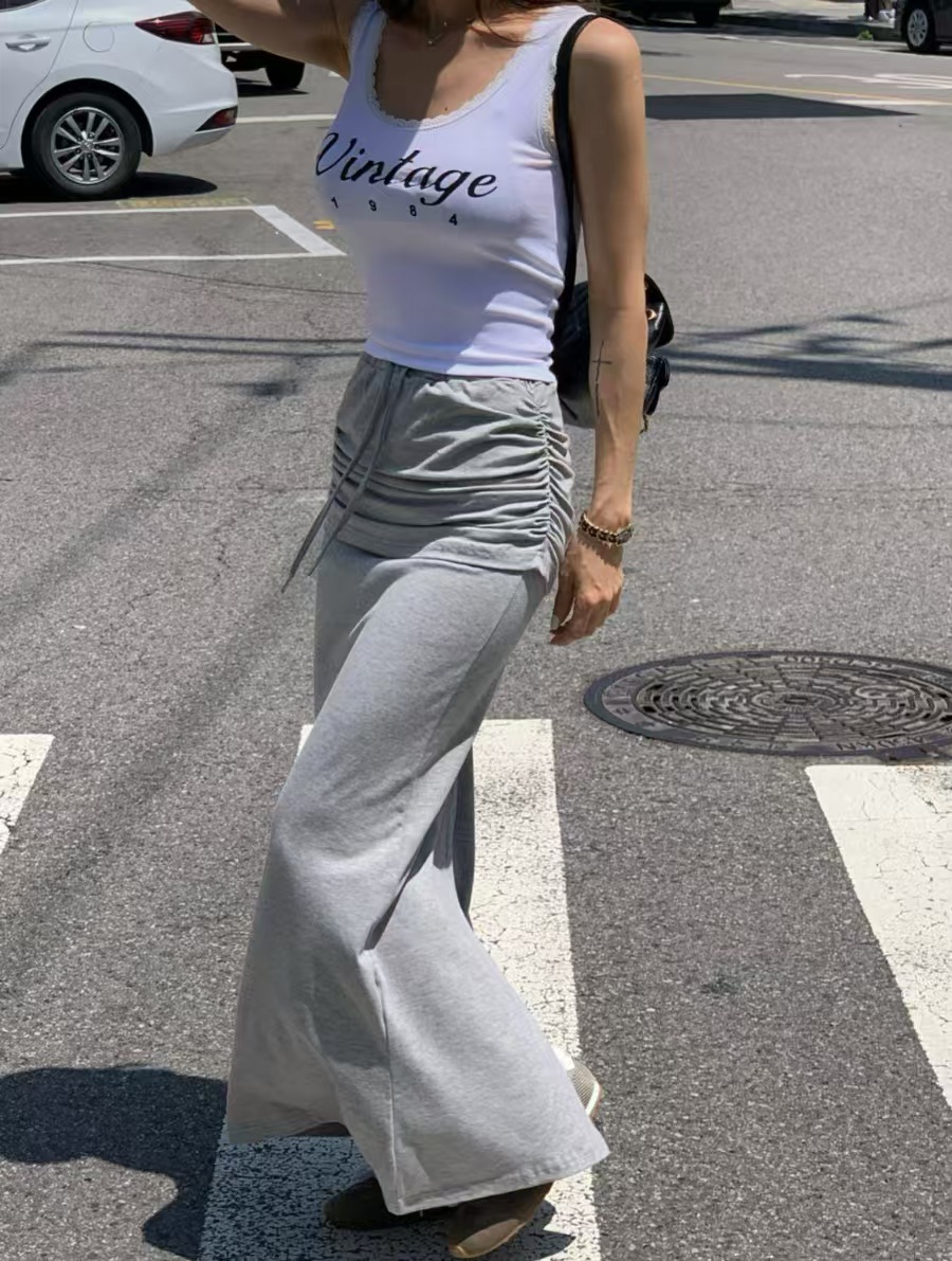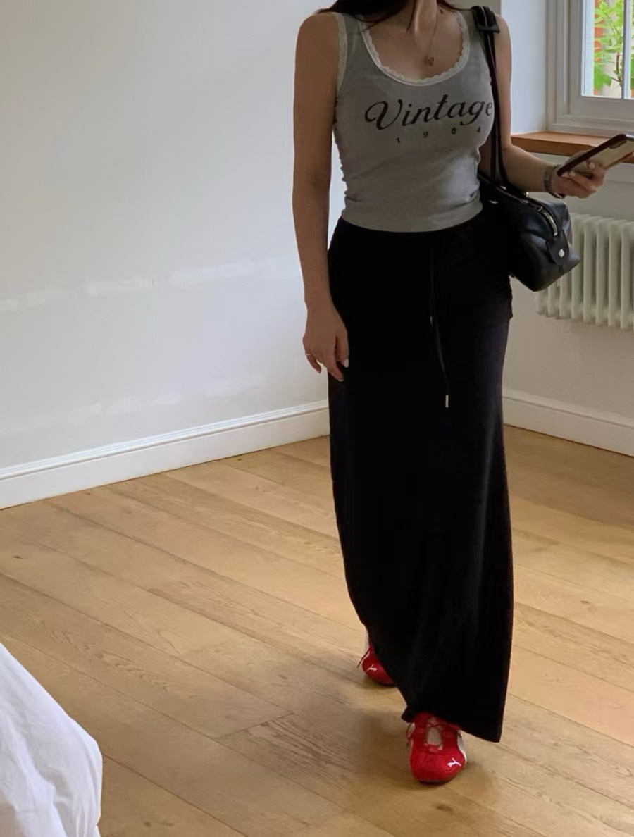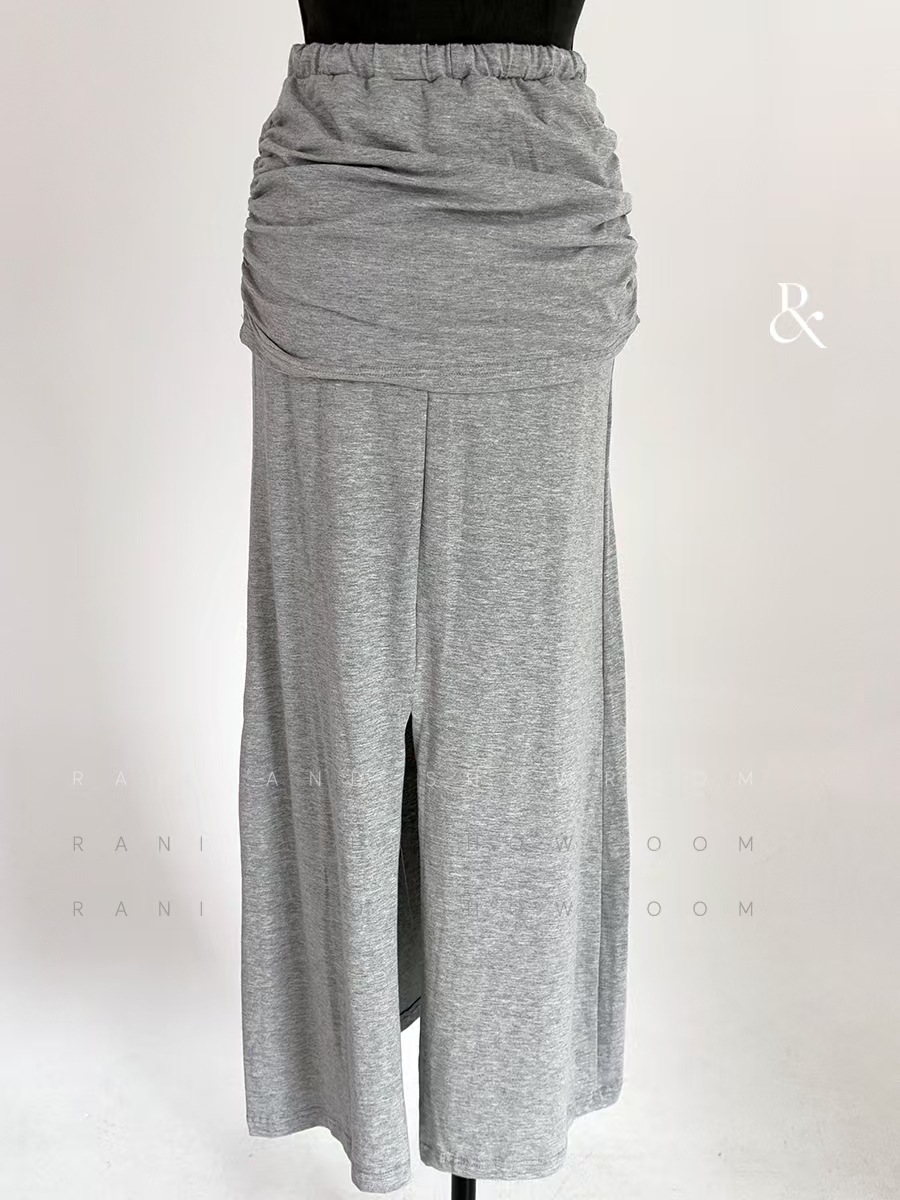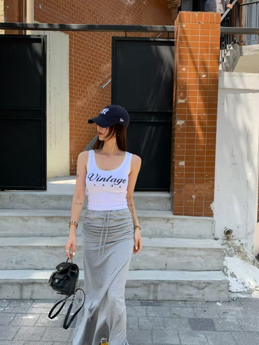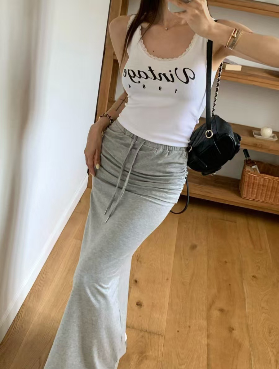 2025년 입하 예정 드로스트링 플리츠 백 슬릿 신축성 있는 허리 하프 기장 힙 스커트