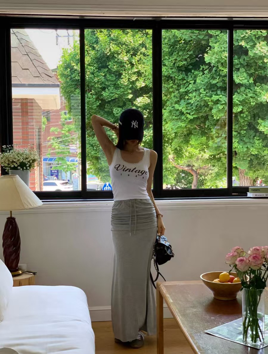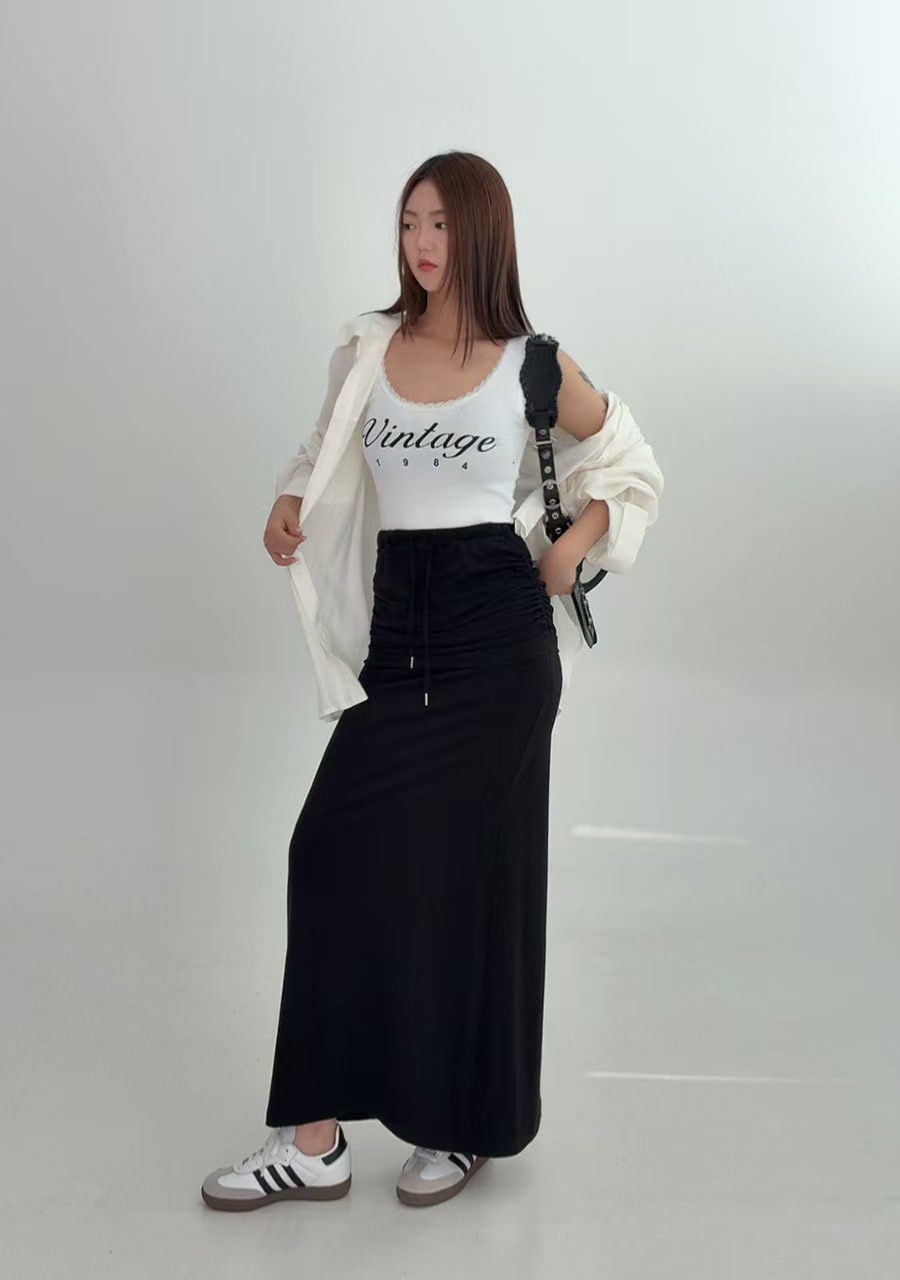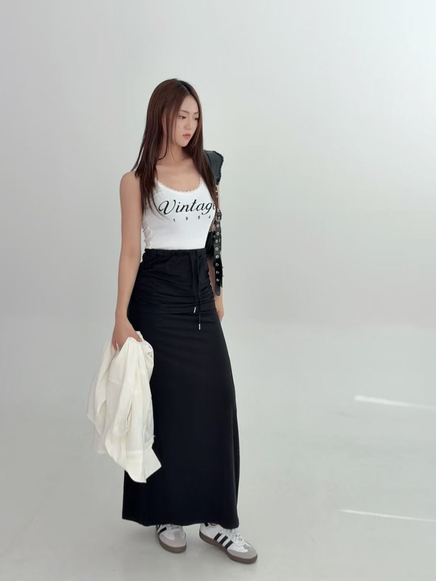 2025년 입하 예정 드로스트링 플리츠 백 슬릿 신축성 있는 허리 하프 기장 힙 스커트스토어 가기