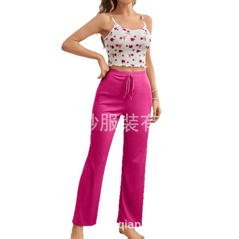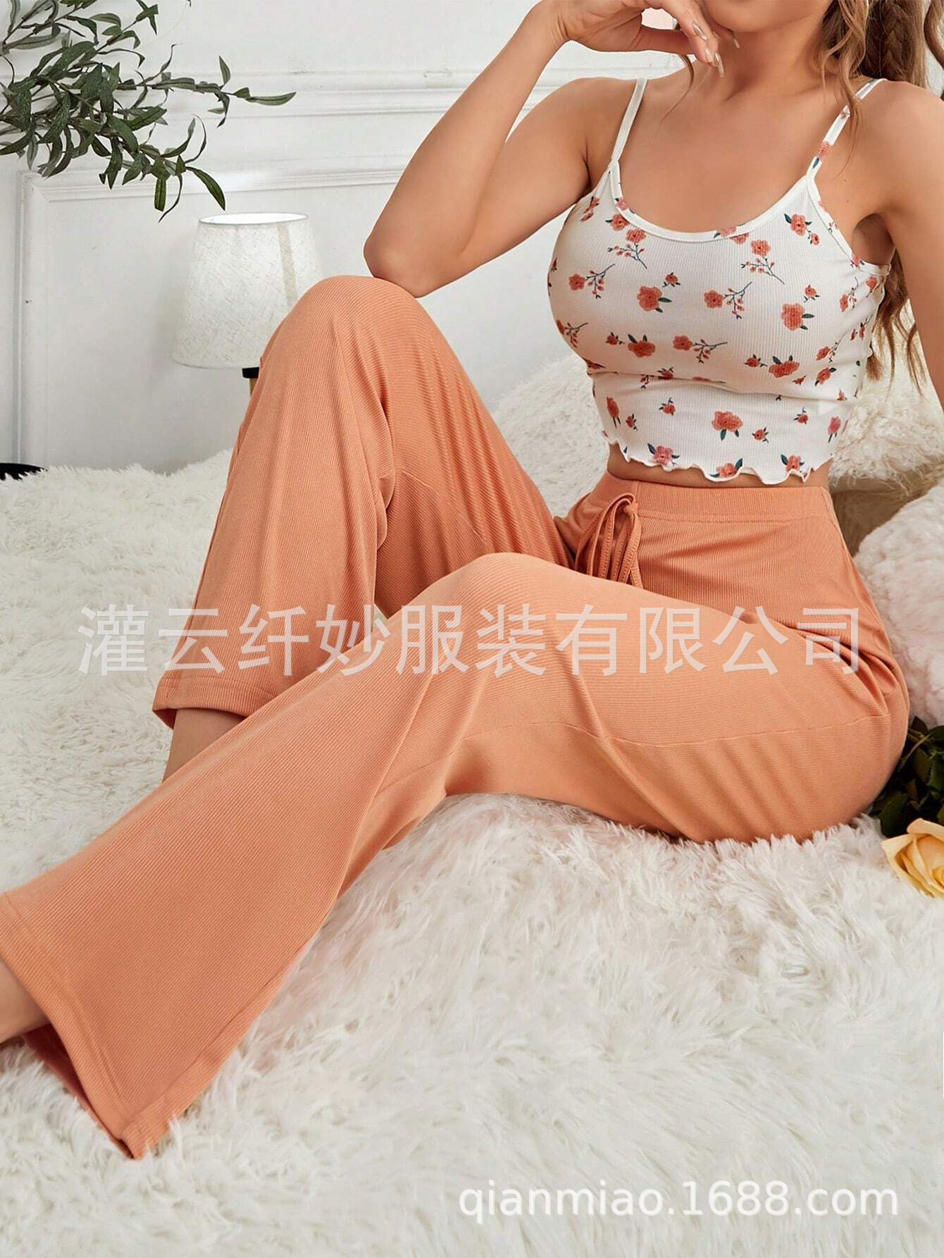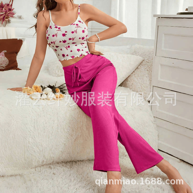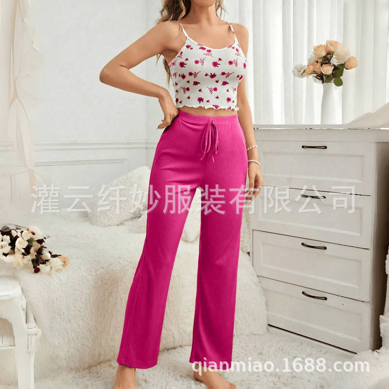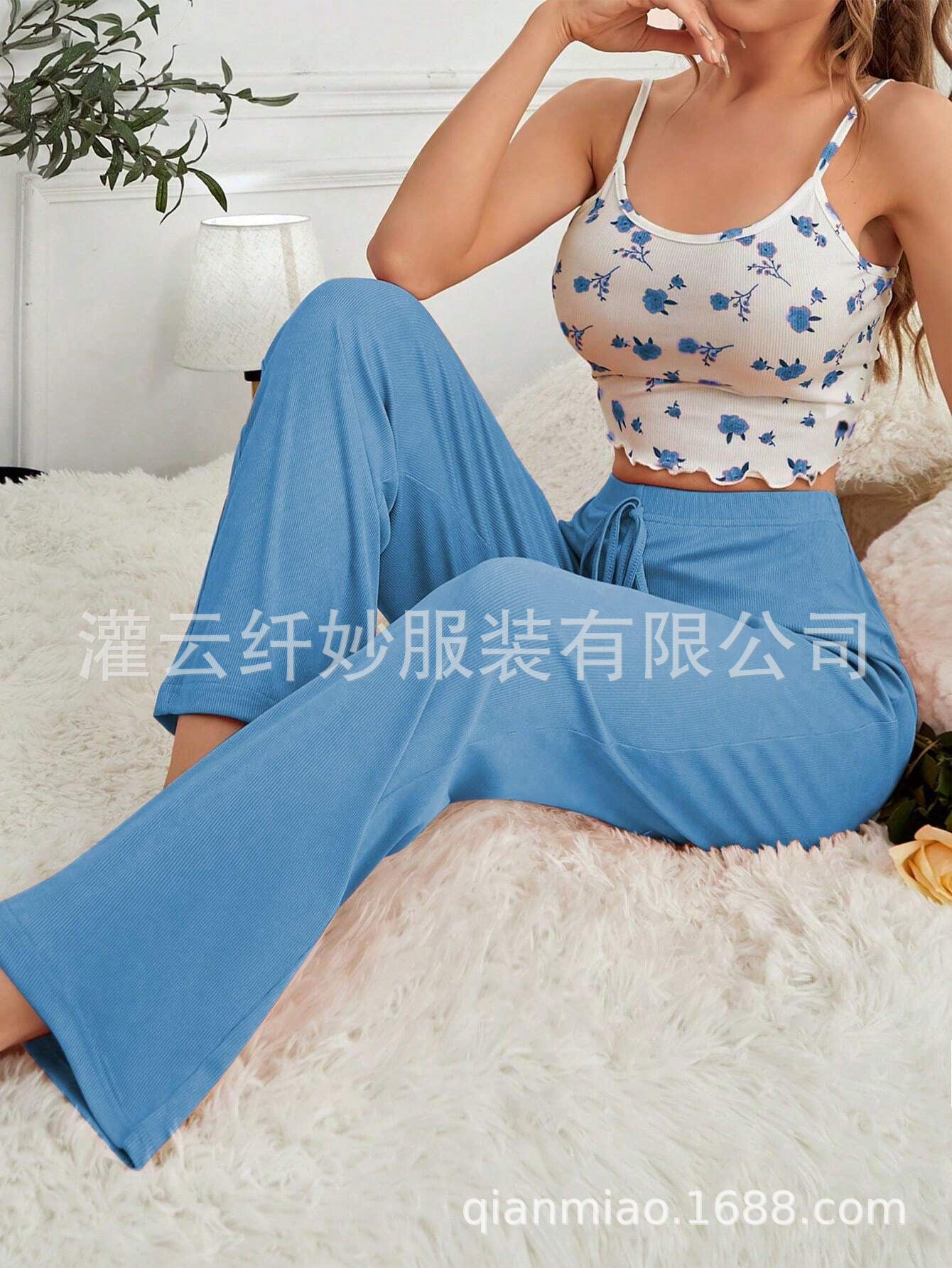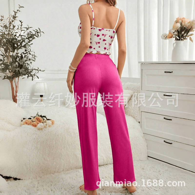 대외 무역 유럽과 미국 스타일의 자카드 핏 스트립 봄 여름 새로운 홈웨어 휴가 캐주얼 잠옷 여성 정장은 밖에서 착용 가능