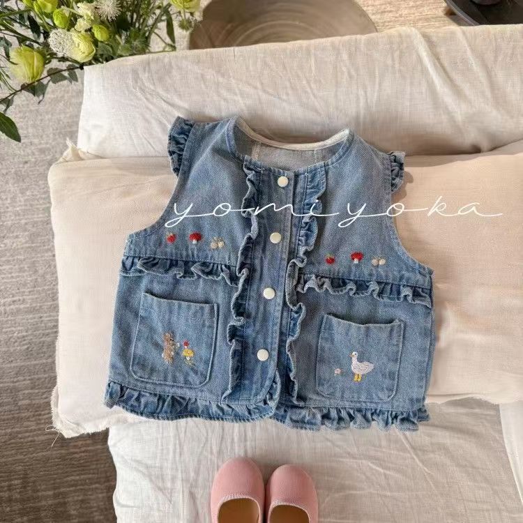 여아 데님 조끼 봄, 가을 새로운 스타일 아동용 베이비 조끼 양복 조끼 아동 의류 자수 재킷 배송