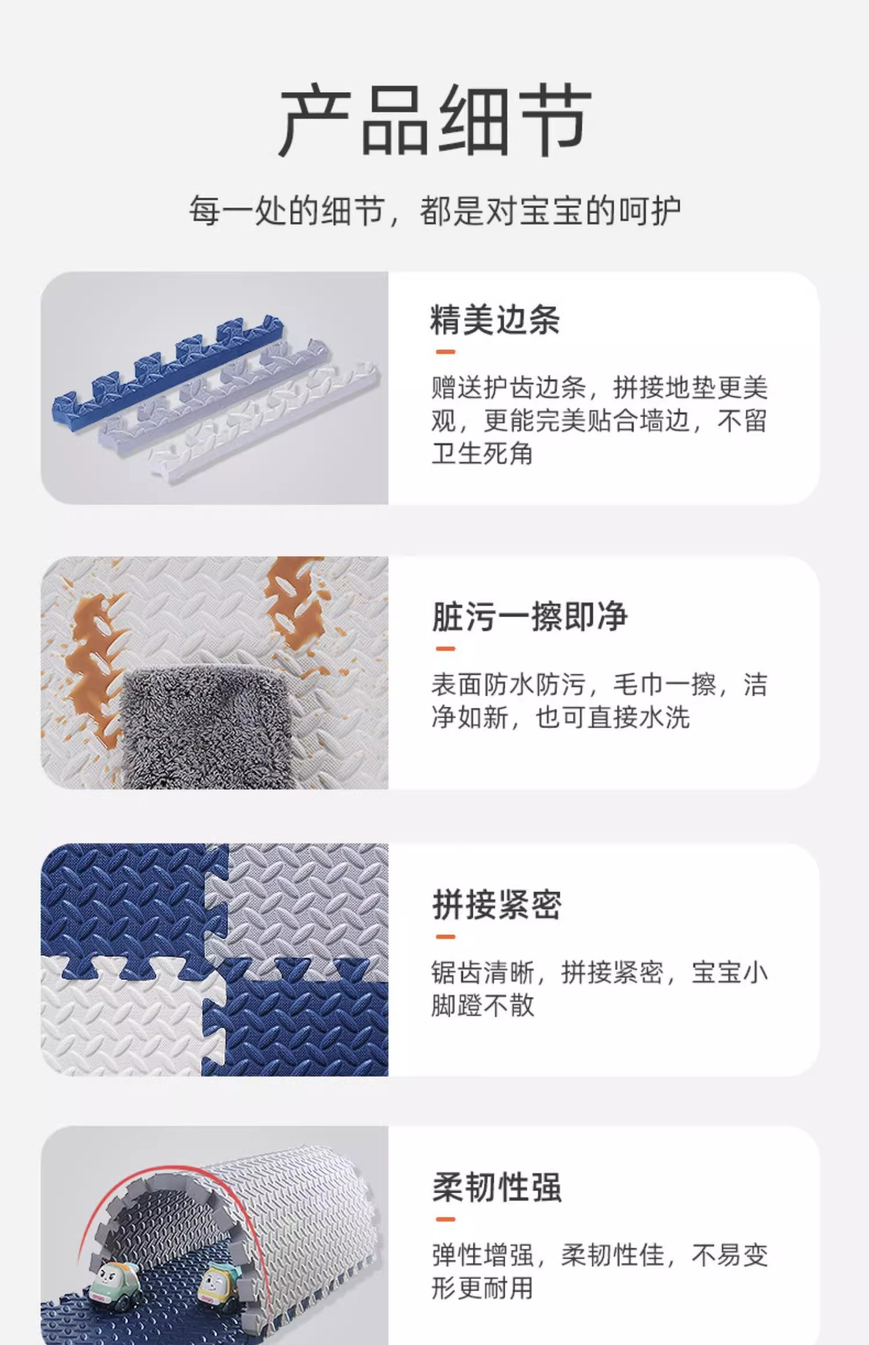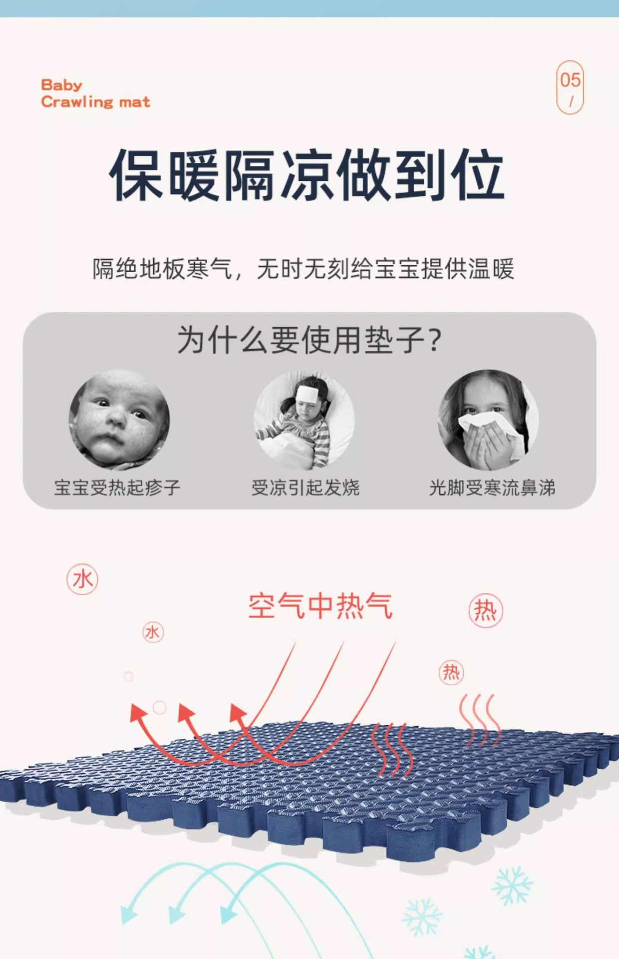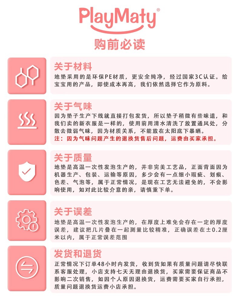 二、垫子是塑料颗粒经高温发泡而成,是有轻微味道的,铺上后通风几天基本就闻不到了,任何厂家都是这样,可放心使用。