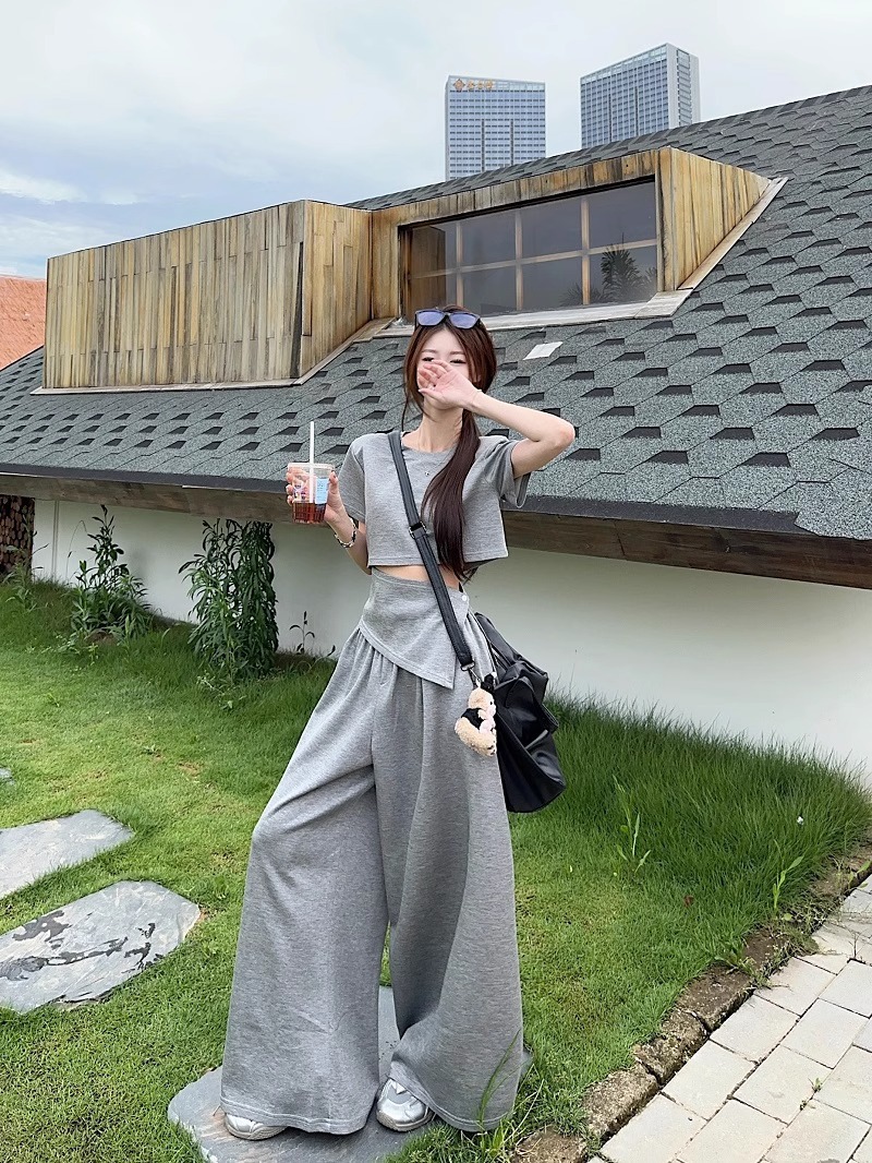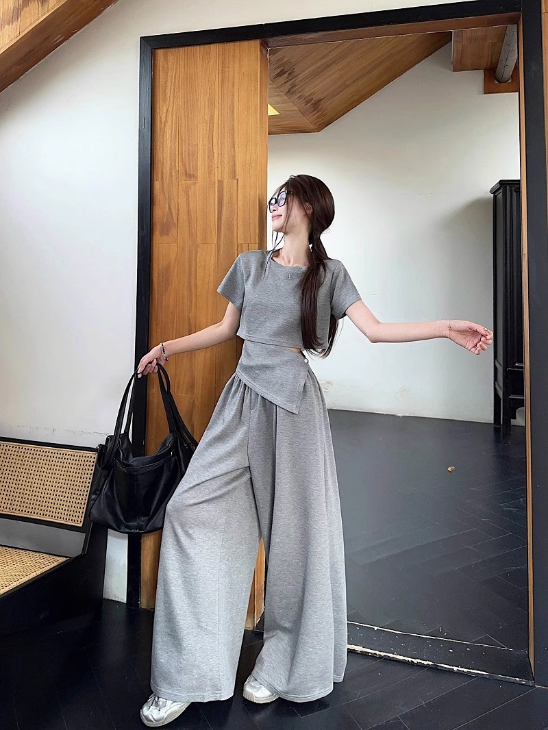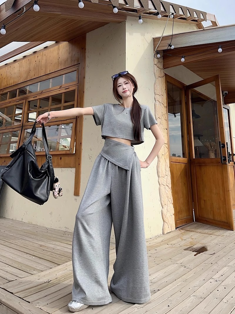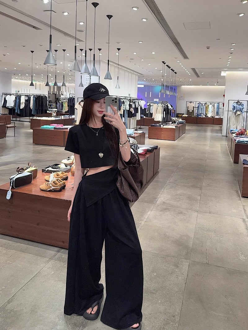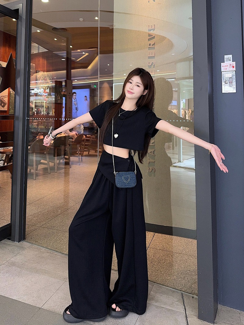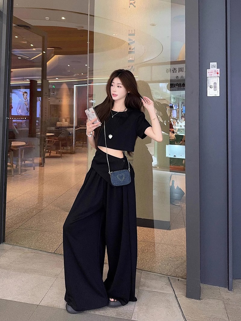 핫 소녀 패션 정장 여성 2025 여름 새로운 높은 허리 슬림 캐주얼 탑 티셔츠 느슨한 와이드 레그 바지 정장스토어 가기