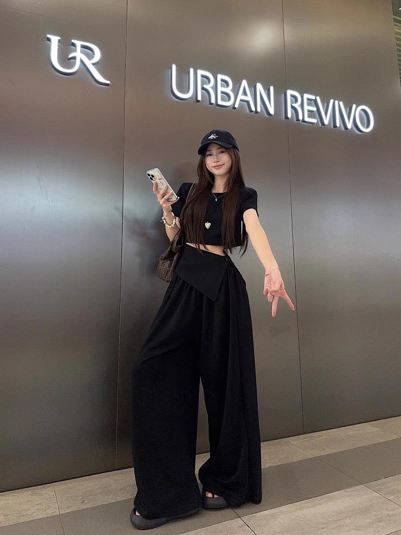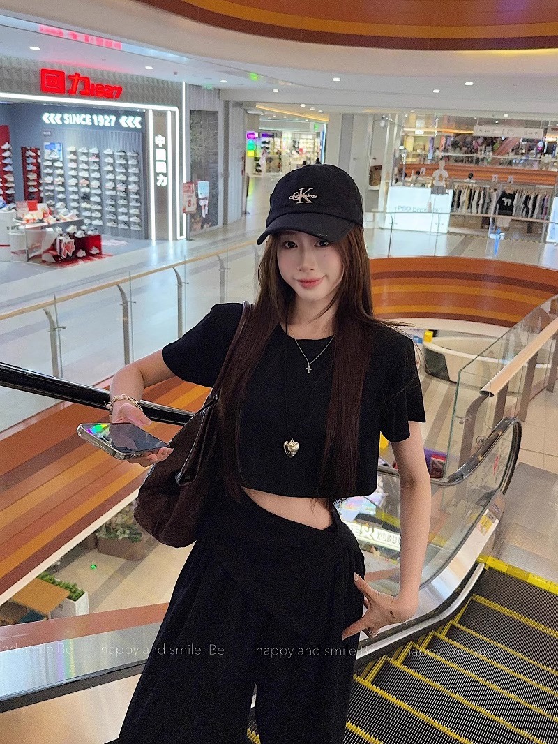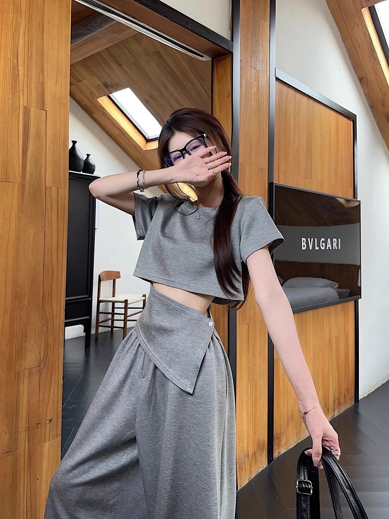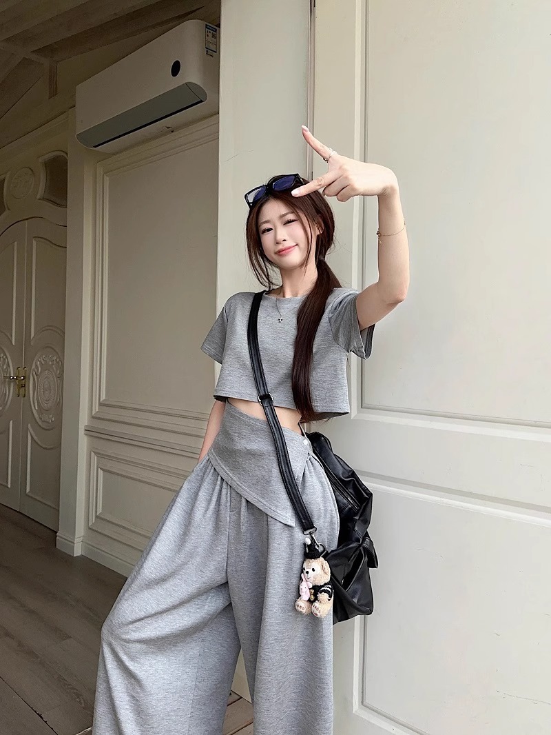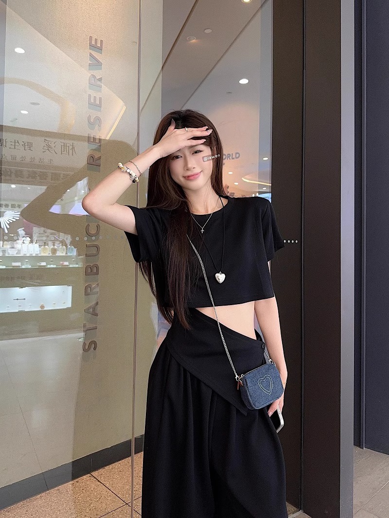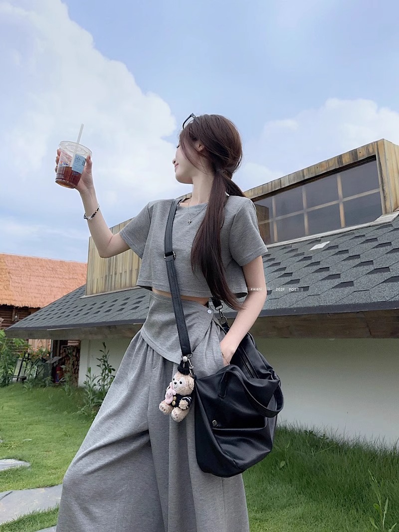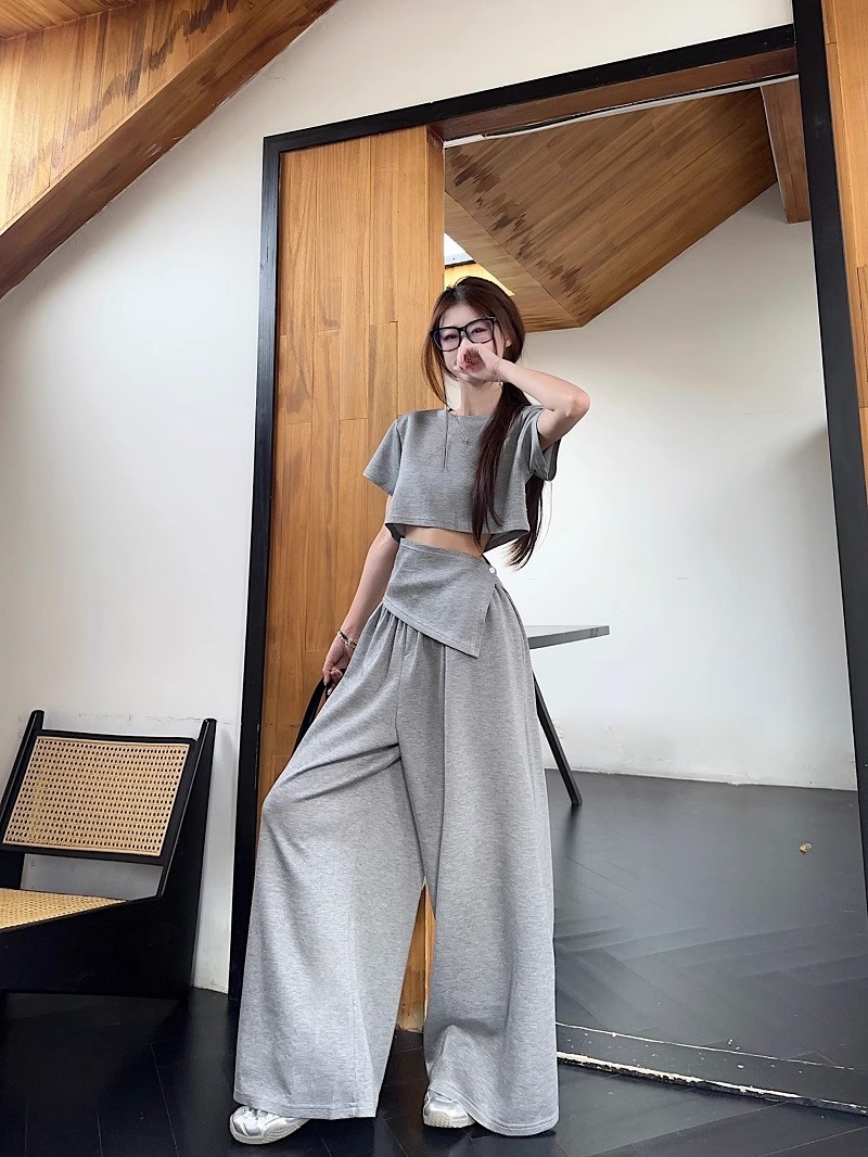 핫 소녀 패션 정장 여성 2025 여름 새로운 높은 허리 슬림 캐주얼 탑 티셔츠 느슨한 와이드 레그 바지 정장스토어 가기
