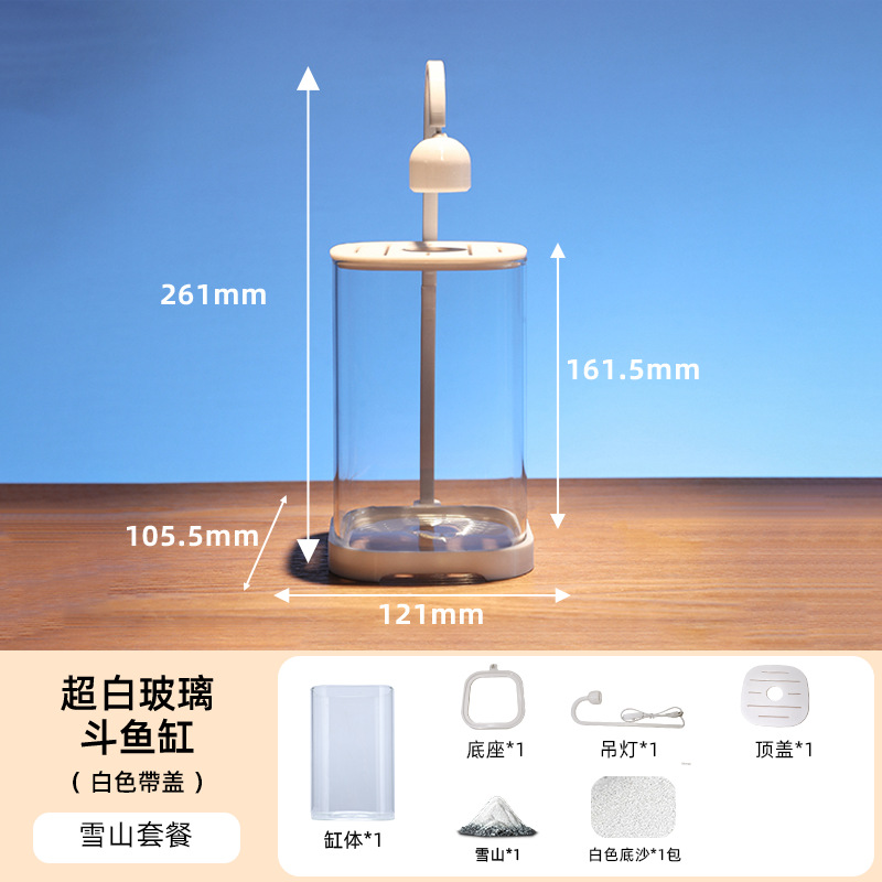 • 초백색 유리 베타 어항 화이트(커버 포함) [스노우 마운틴 패키지] - 탱크 본체 + 상단 커버 + 베이스 + 샹들리에 + 스노우 마운틴 + 화이트 바닥 모래