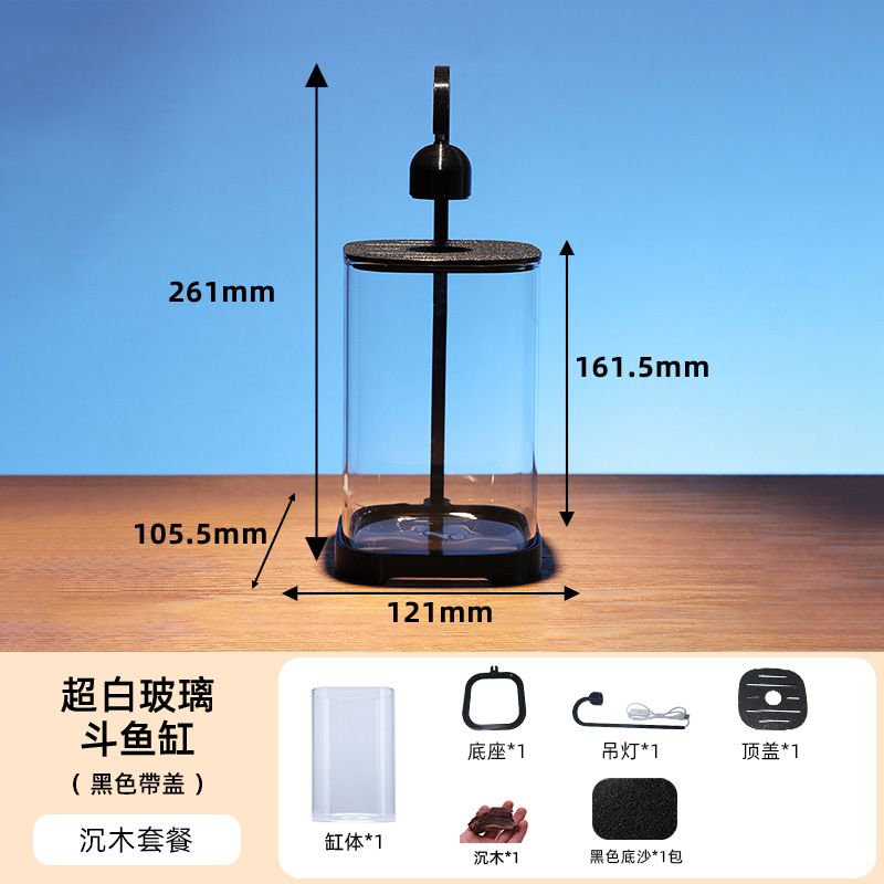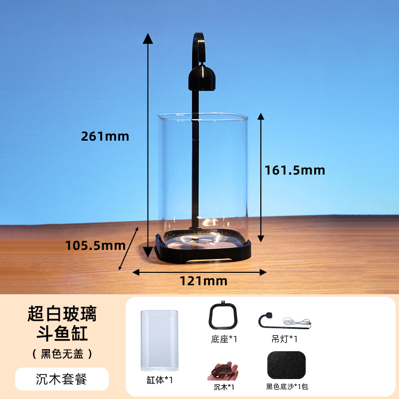 • 커버가 없는 블랙 슈퍼 화이트 유리 베타 어항 [싱크 우드 패키지] - 탱크 본체 + 베이스 + 샹들리에 + 싱크 우드 + 블랙 바닥 모래