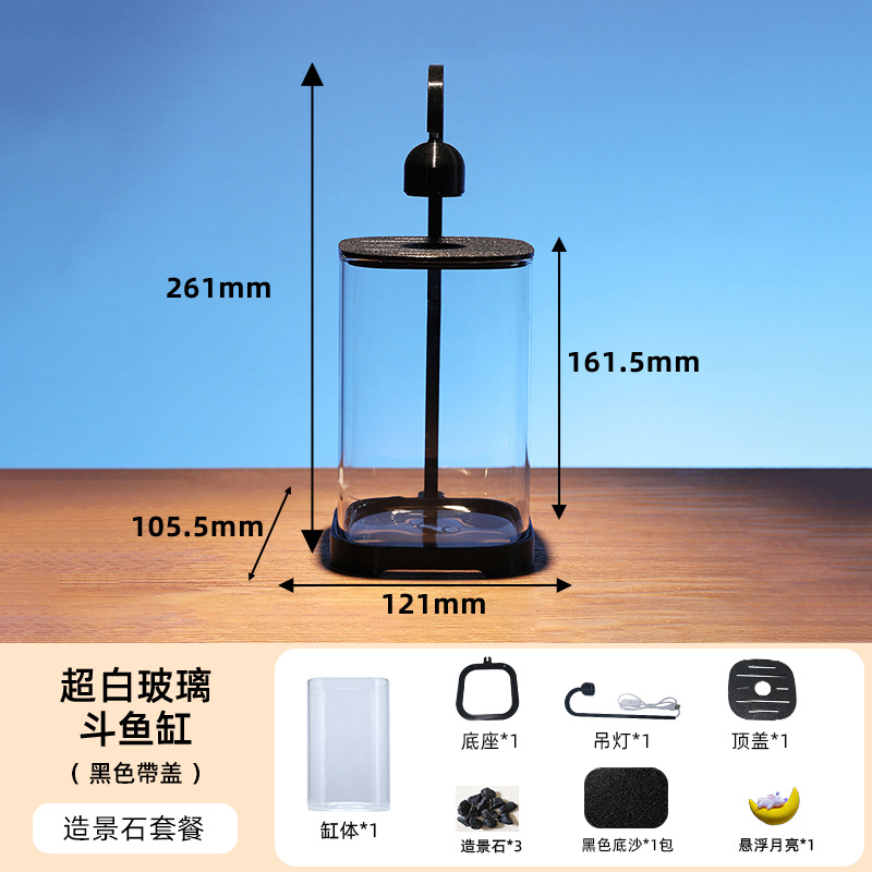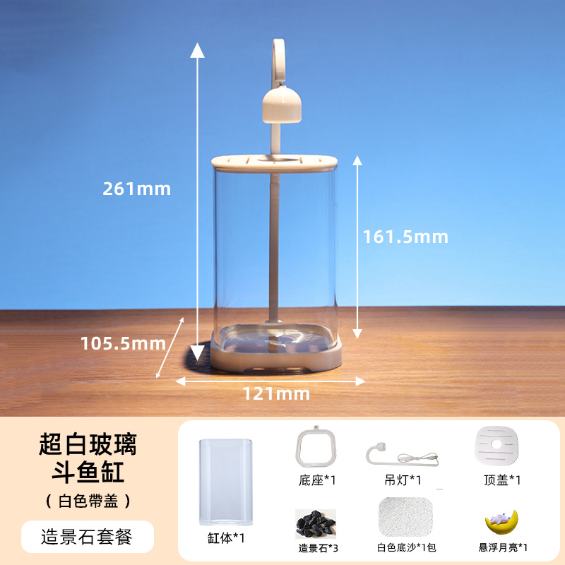 • 뚜껑이 있는 초백색 유리 베타 어항 [조경석 패키지] - 탱크 본체 + 상단 덮개 + 베이스 + 샹들리에 + 검은색 조경석 + 매달린 달 + 흰색 바닥 모래