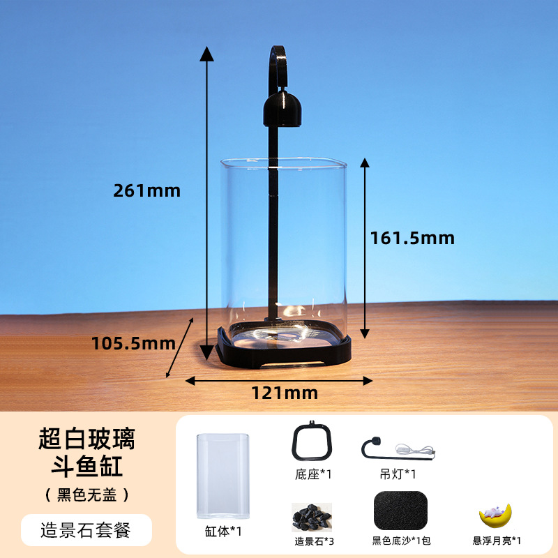 • 커버가 없는 블랙 슈퍼 화이트 유리 베타 어항 [조경석 패키지] - 탱크 본체 + 베이스 + 샹들리에 + 블랙 조경석 + 매달린 달 + 블랙 바닥 모래