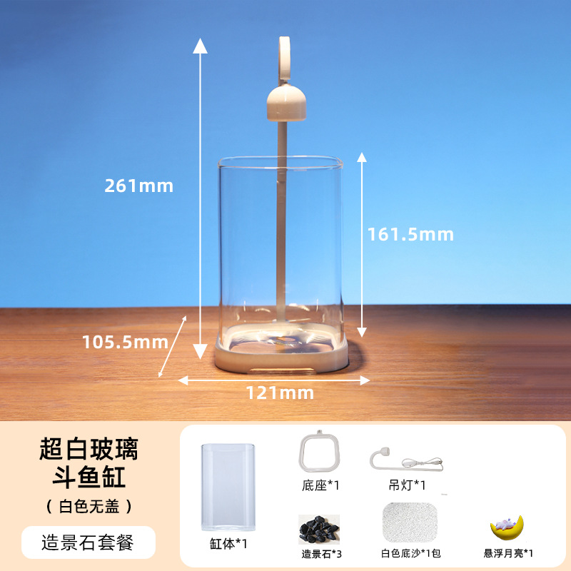 • 커버가 없는 초백색 유리 베타 어항 [조경석 패키지] - 탱크 본체 + 베이스 + 샹들리에 + 검은색 조경석 + 매달린 달 + 흰색 바닥 모래