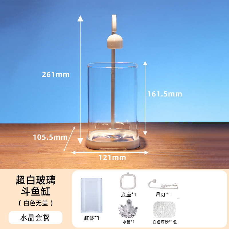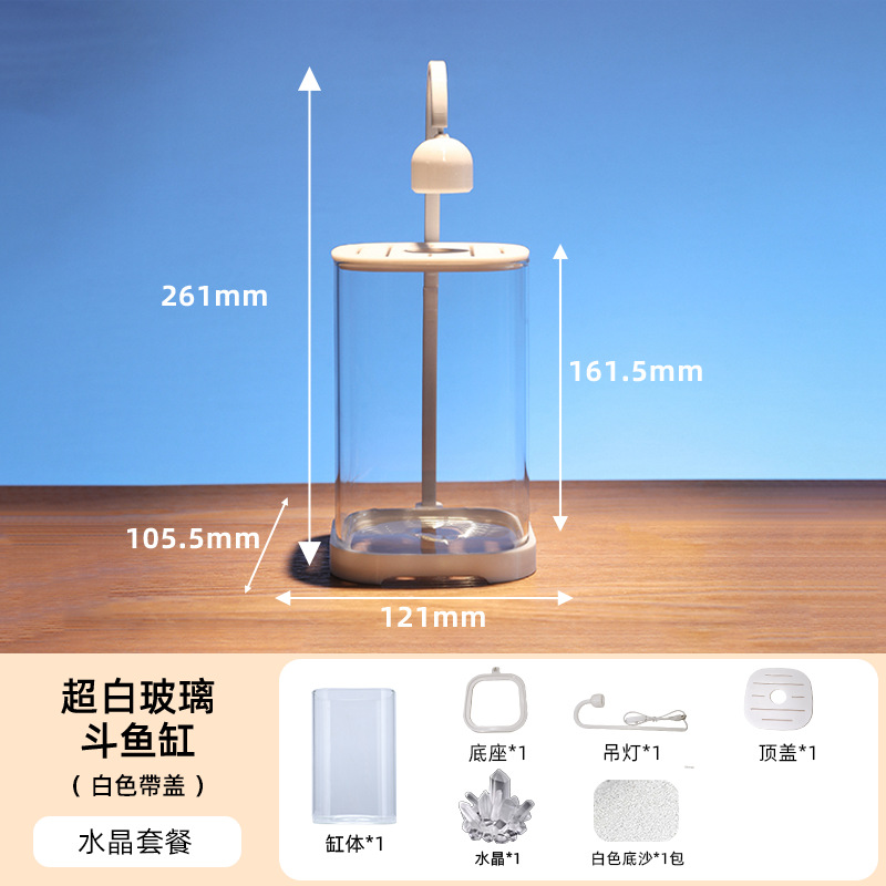 • 초백색 유리 베타 어항 화이트 뚜껑 포함 [크리스탈 세트] - 어항 본체 + 덮개 + 받침대 + 조명 + 크리스탈 장식 + 화이트 바닥 모래
