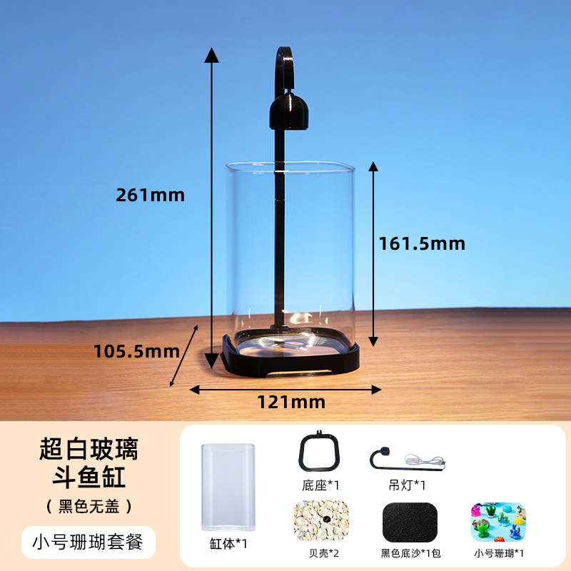 • 커버가 없는 블랙 슈퍼 화이트 유리 베타 어항 [소형 산호 패키지] - 탱크 본체 + 베이스 + 샹들리에 + 소형 산호 + 조개 + 검정색 바닥 모래