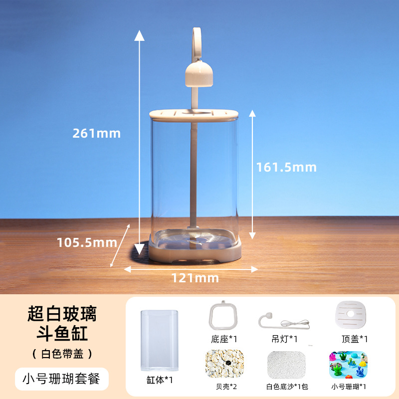 • 초백색 유리 베타 어항 흰색 뚜껑 포함 [소형 산호 세트] - 어항 본체 + 덮개 + 받침대 + 조명 + 소형 산호 + 조개껍데기 + 흰색 바닥 모래