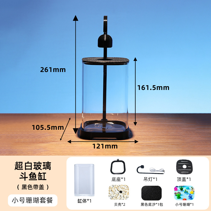 • 슈퍼 화이트 유리 베타 어항 블랙 커버 포함 [소형 산호 패키지] - 탱크 본체 + 상단 커버 + 베이스 + 샹들리에 + 소형 산호 + 껍질 + 검정색 바닥 모래