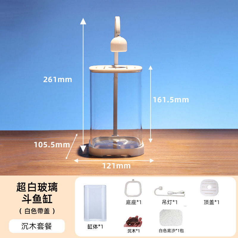 • 뚜껑이 있는 초백색 유리 베타 어항 [싱크된 나무 패키지] - 탱크 본체 + 상단 덮개 + 베이스 + 샹들리에 + 싱크된 나무 + 흰색 바닥 모래