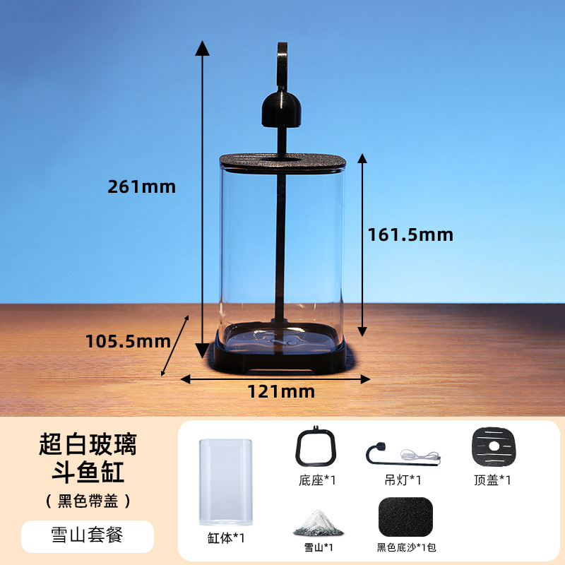 • 커버가 없는 블랙 슈퍼 화이트 유리 베타 어항 [스노우 마운틴 패키지] - 탱크 본체 + 베이스 + 샹들리에 + 스노우 마운틴 + 블랙 바닥 모래