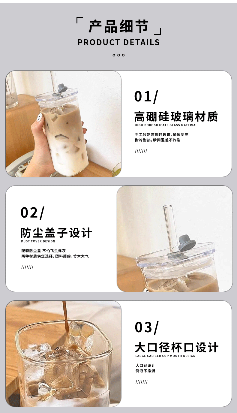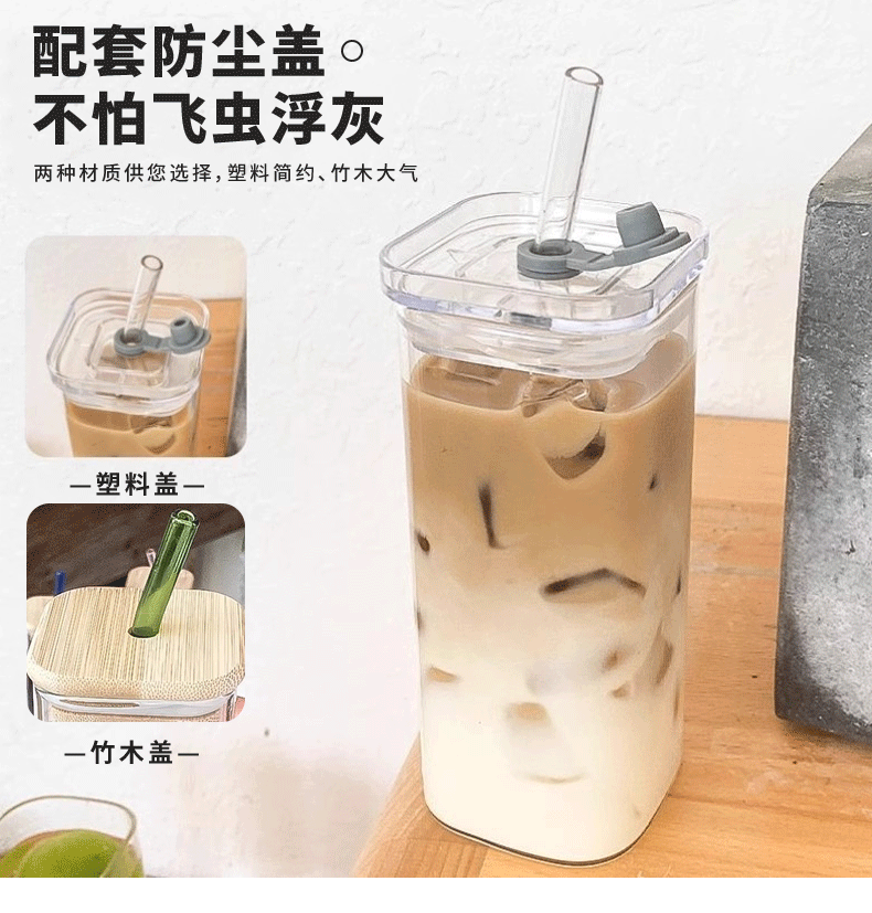 뚜껑이 있는 한국식 사각 유리 물컵, 투명하고 간단한 가열 컵, 가정용 커피 컵, 주스 컵스토어 가기
