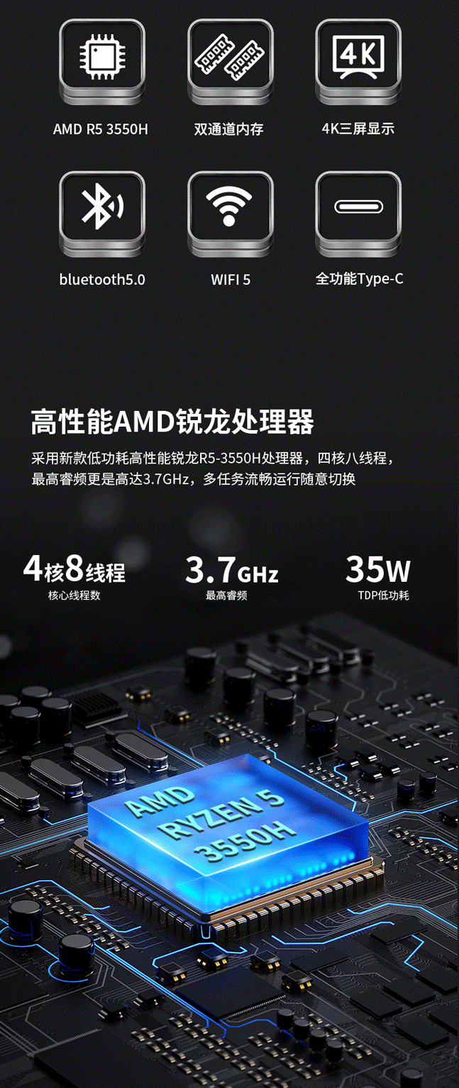 지벤 미니 컴퓨터 AMD 라이젠 R5-3550H 휴대용 미니 PC 사무실 게임 가정용 시어터 4K3 화면