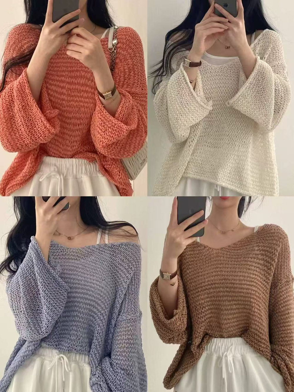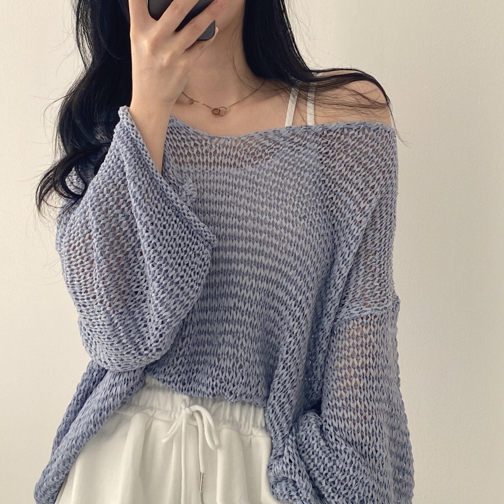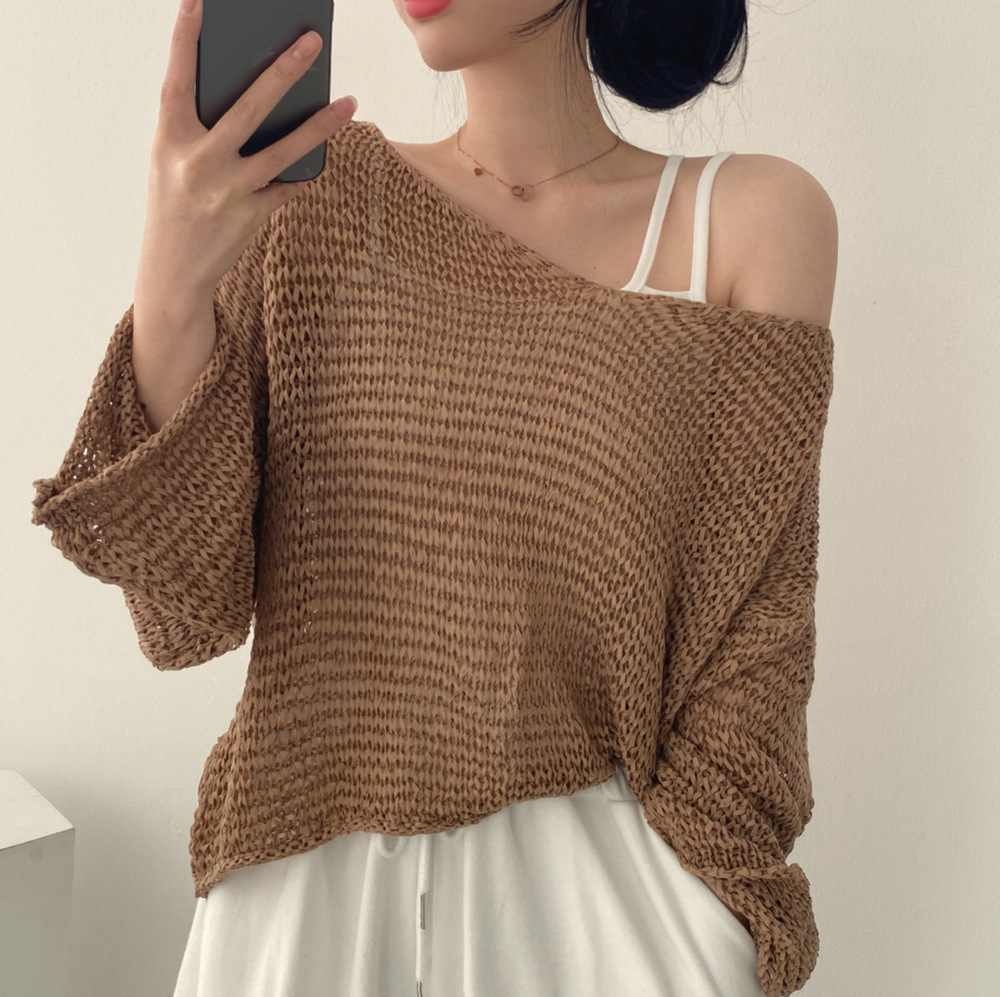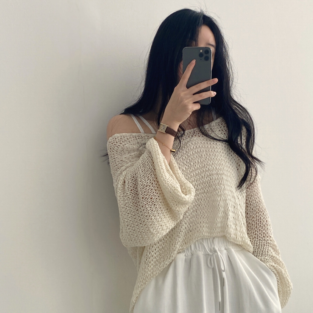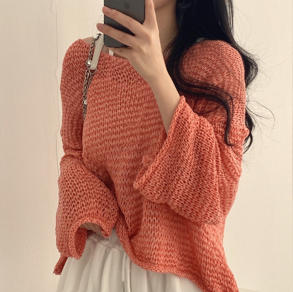 여성용 한국식 루즈한 니트 스웨터, 얇은 중공 디자인, 오프숄더 퓨어 러스트 블라우스, 프렌치 스위트 긴팔 탑스토어 가기