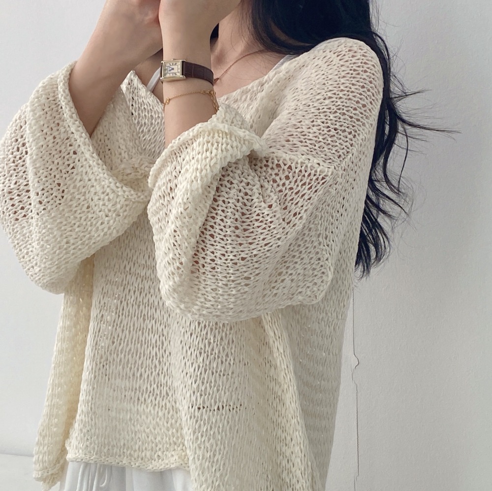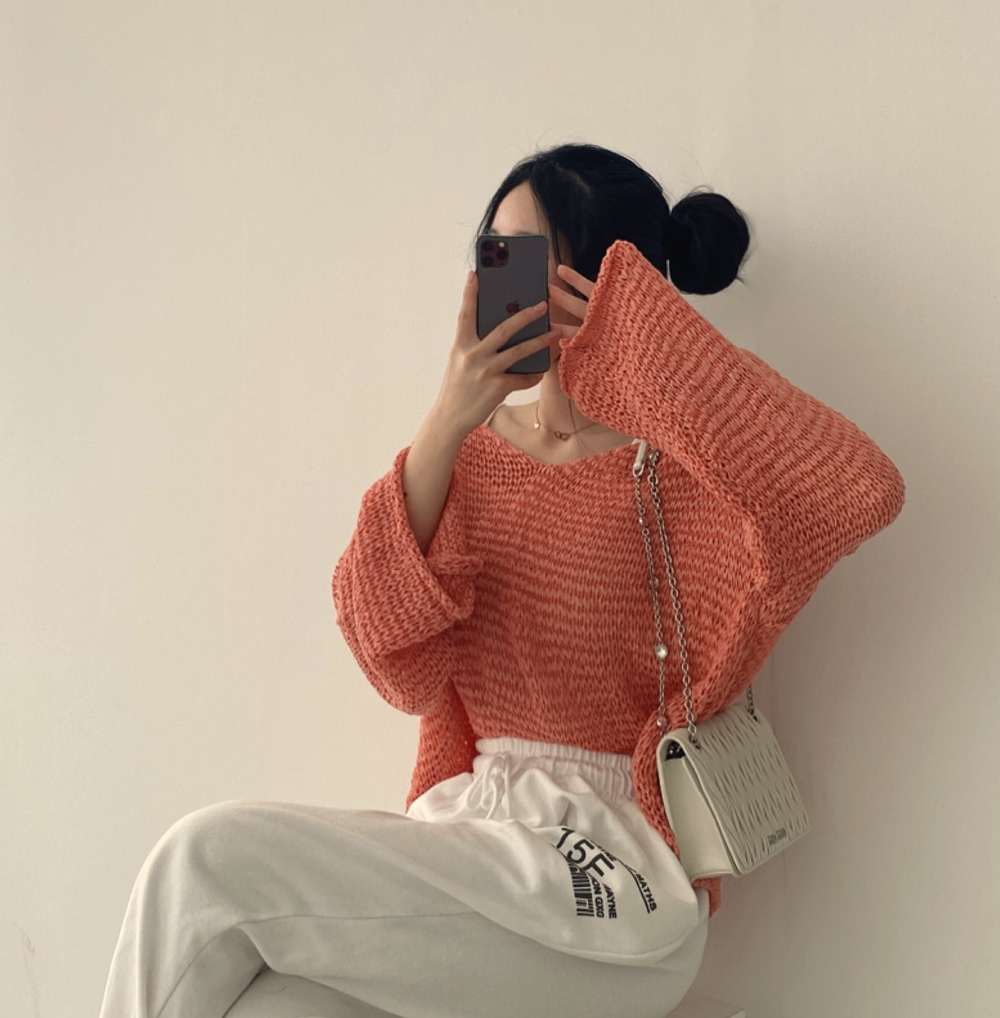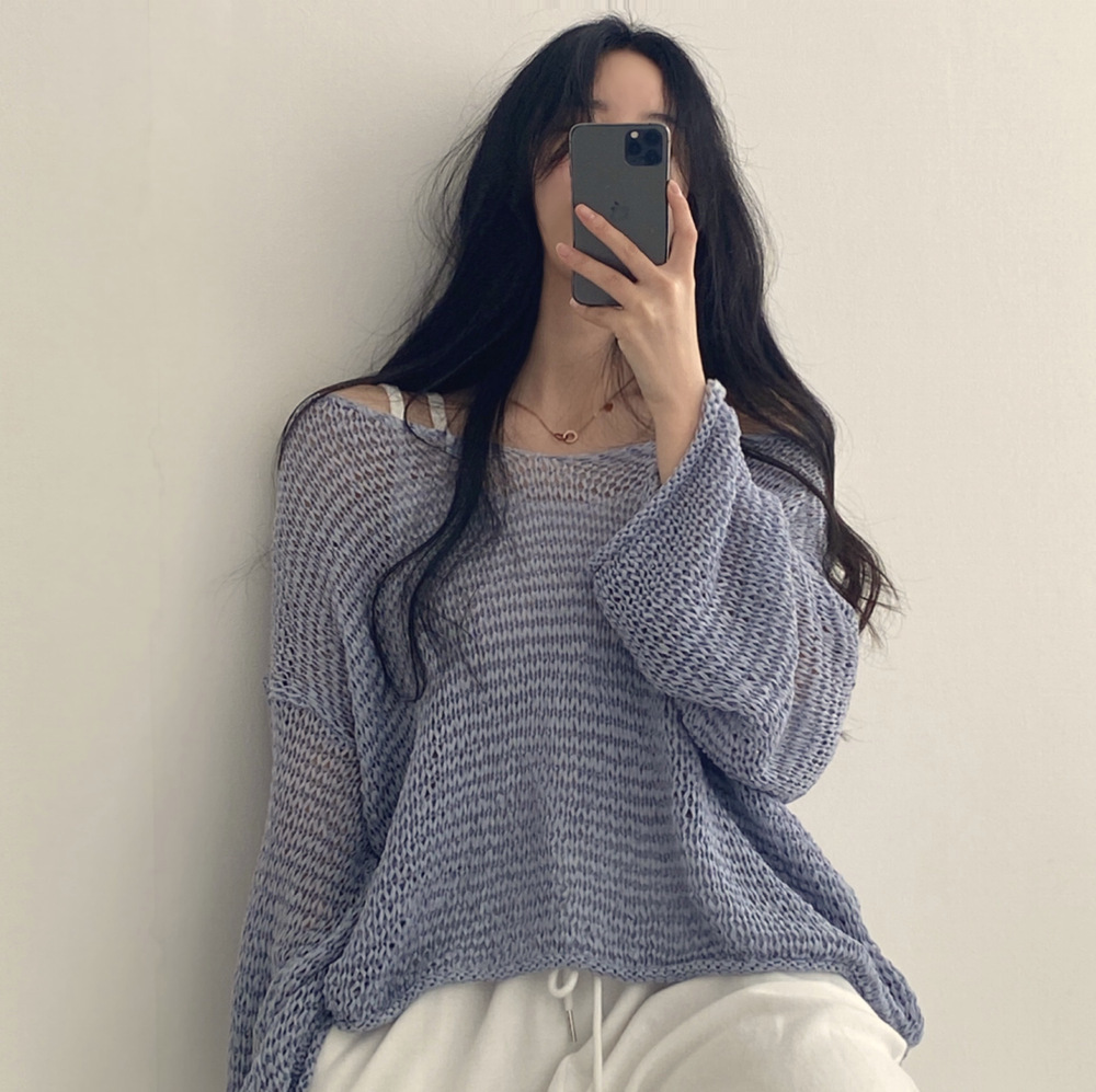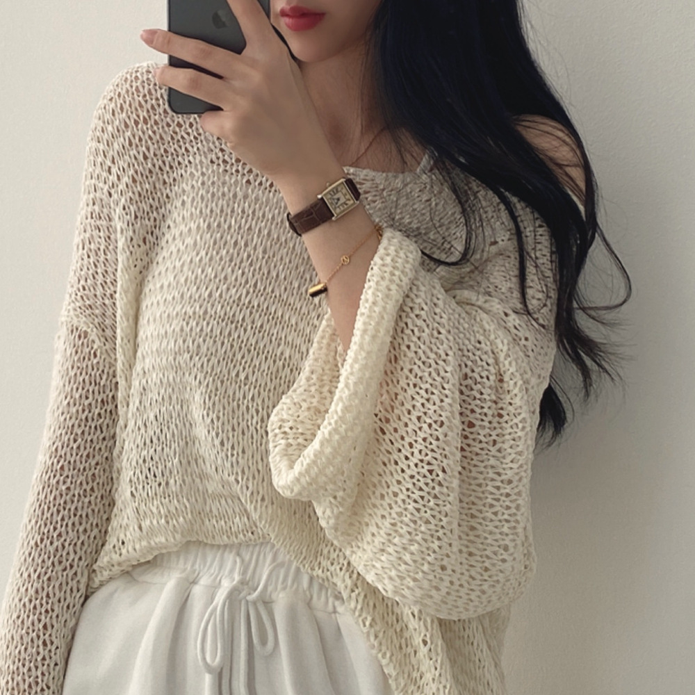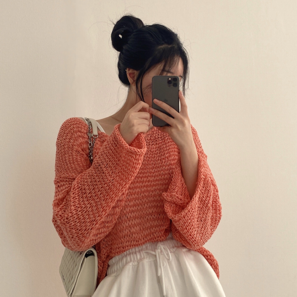 여성용 한국식 루즈한 니트 스웨터, 얇은 중공 디자인, 오프숄더 퓨어 러스트 블라우스, 프렌치 스위트 긴팔 탑스토어 가기