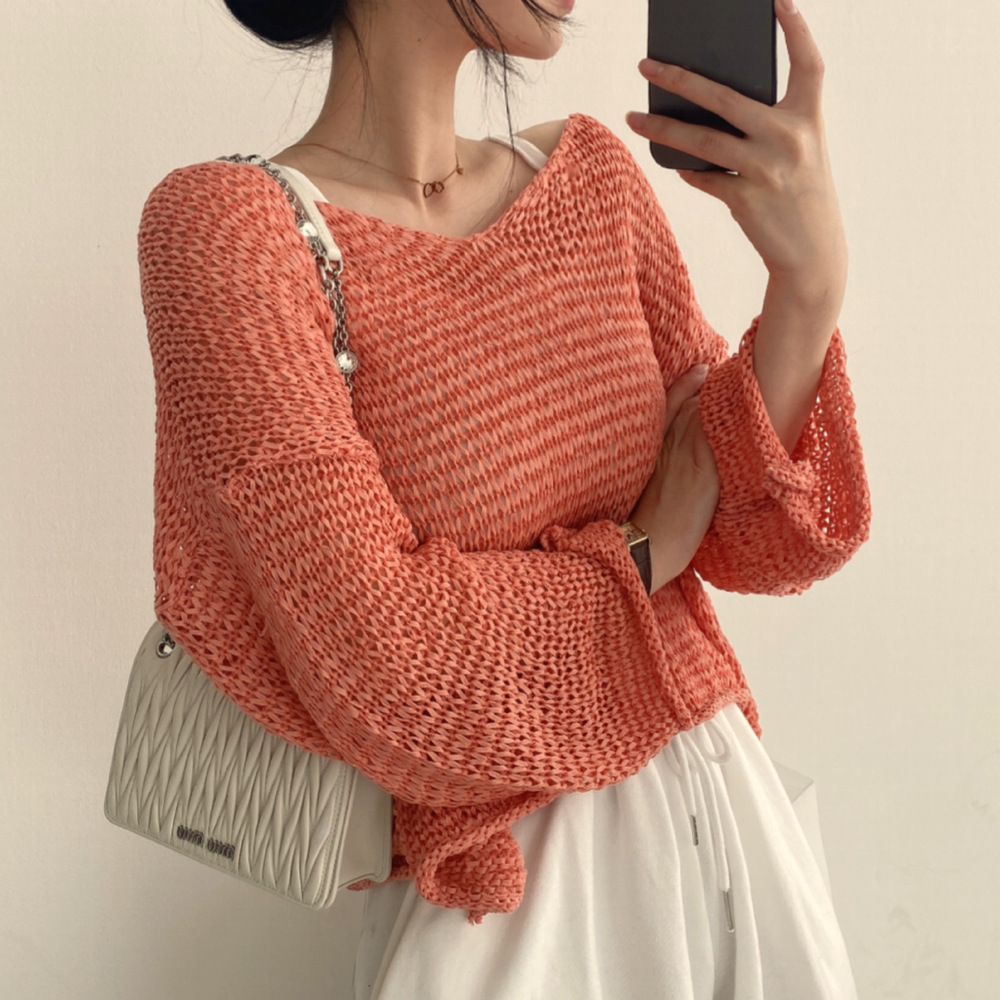 여성용 한국식 루즈한 니트 스웨터, 얇은 중공 디자인, 오프숄더 퓨어 러스트 블라우스, 프렌치 스위트 긴팔 탑