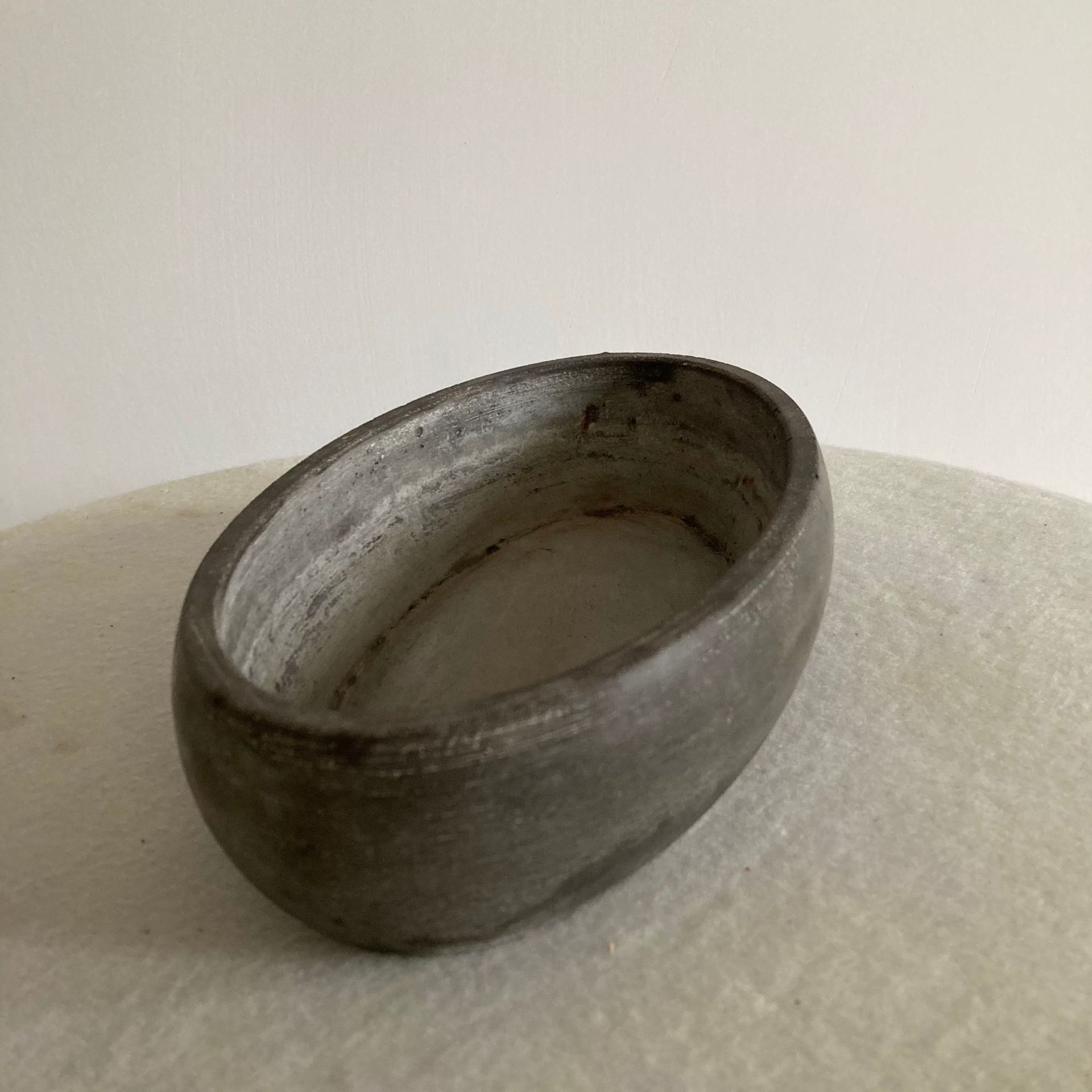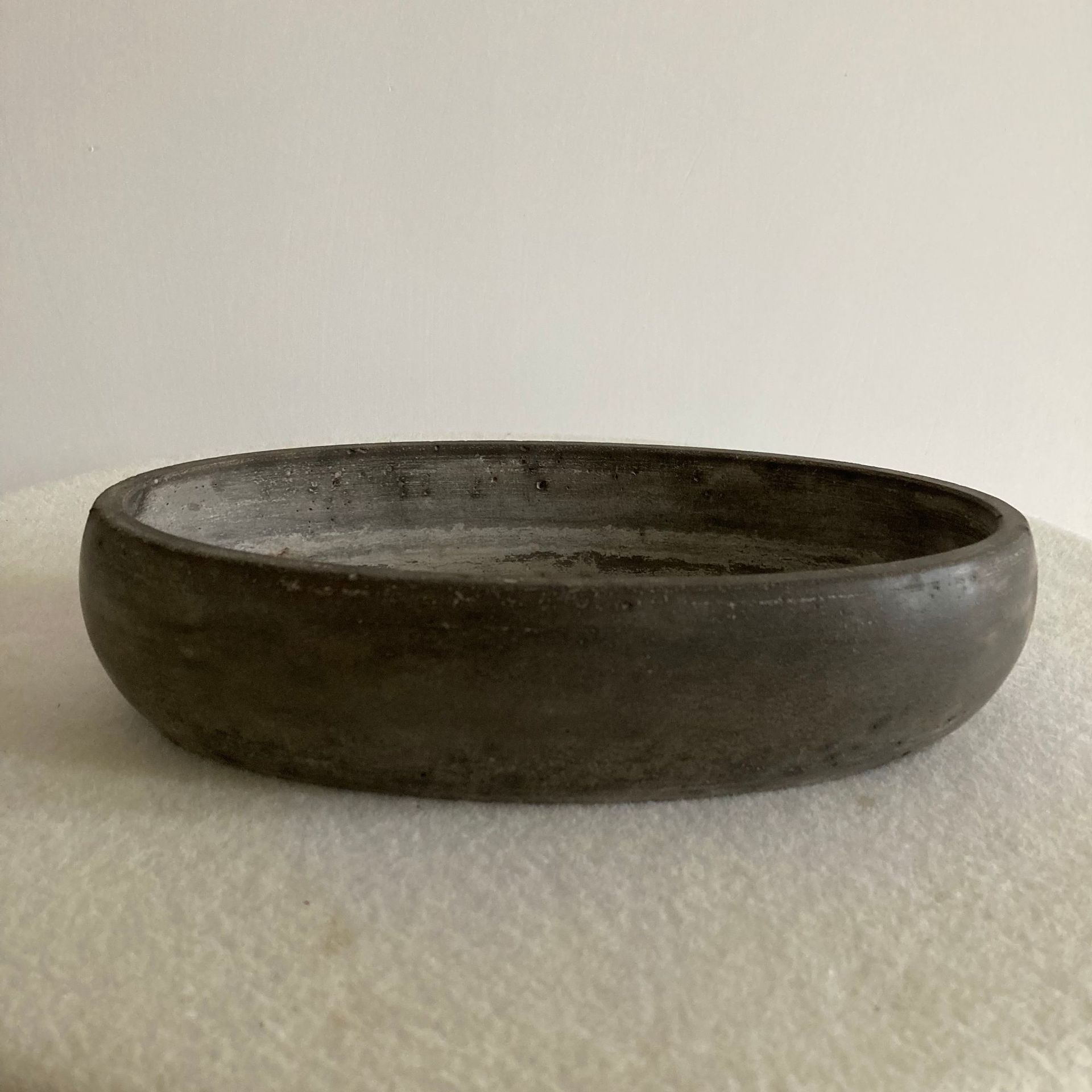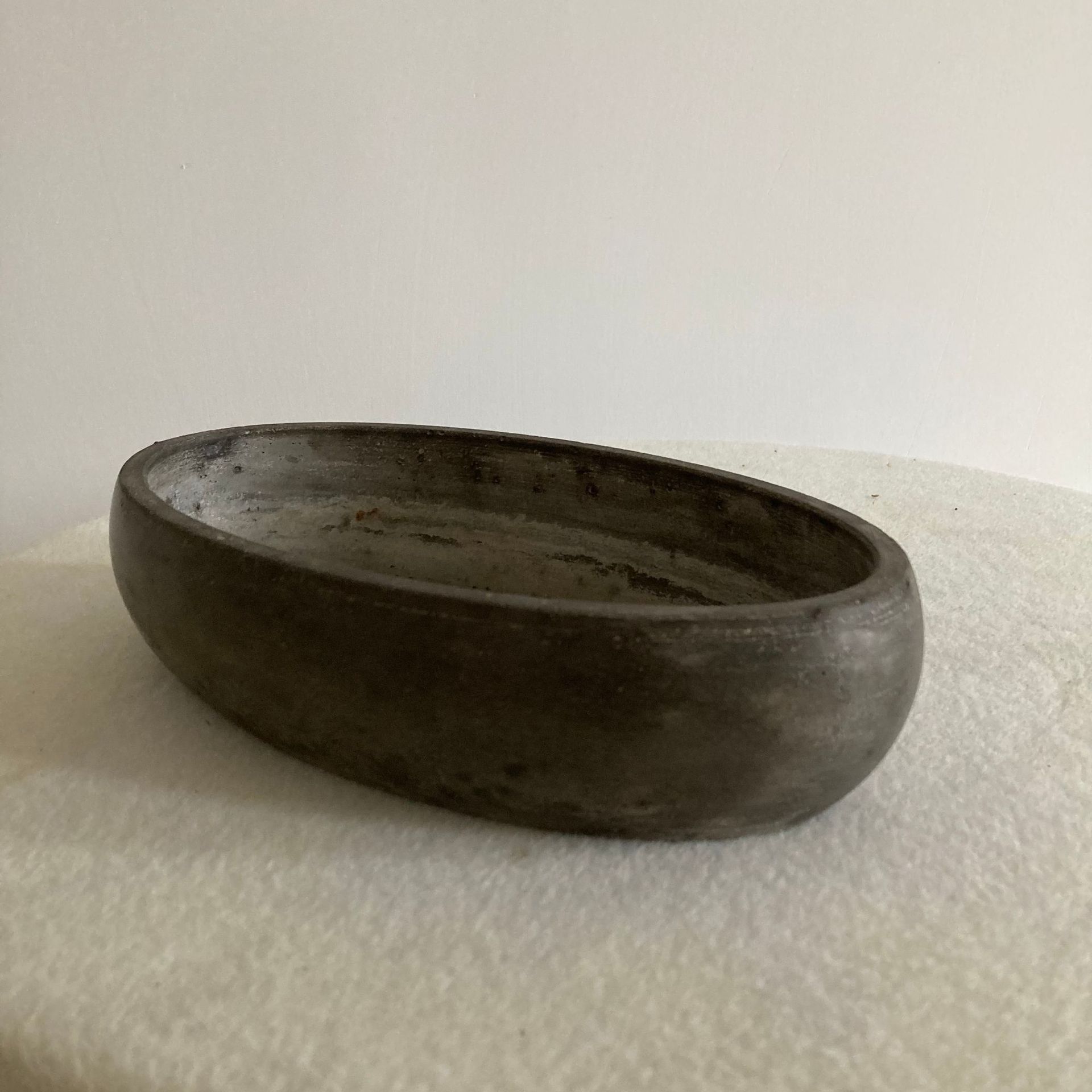 卵形浅花盆的形状较为圆润流畅,能够为山水假山盆景提供自然、柔和的基底,有助于营造出如湖泊、溪流等自然水景的感觉,使整个盆景景观更加协调统一。