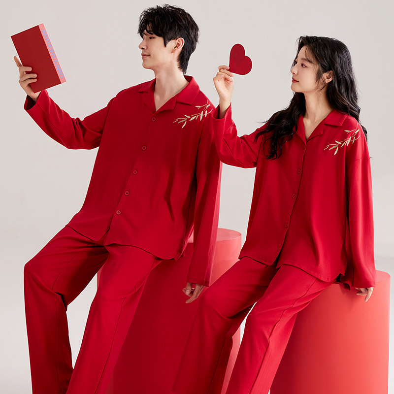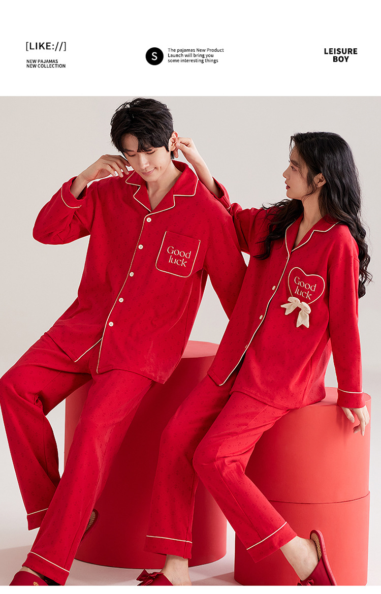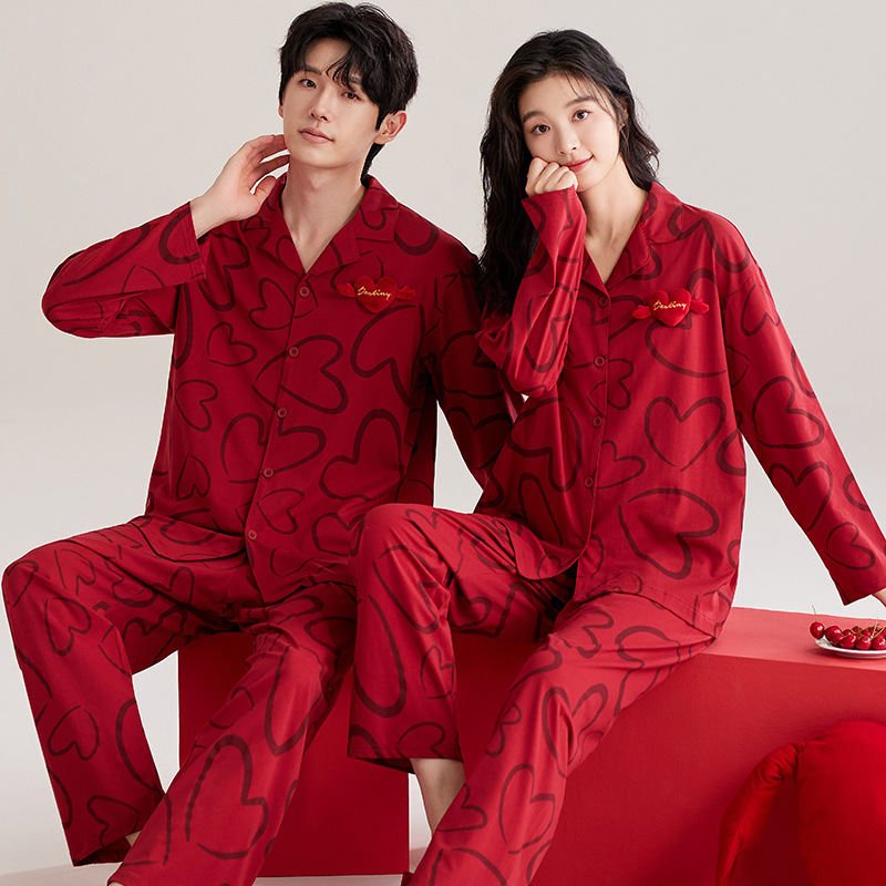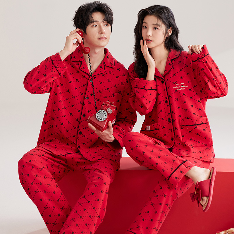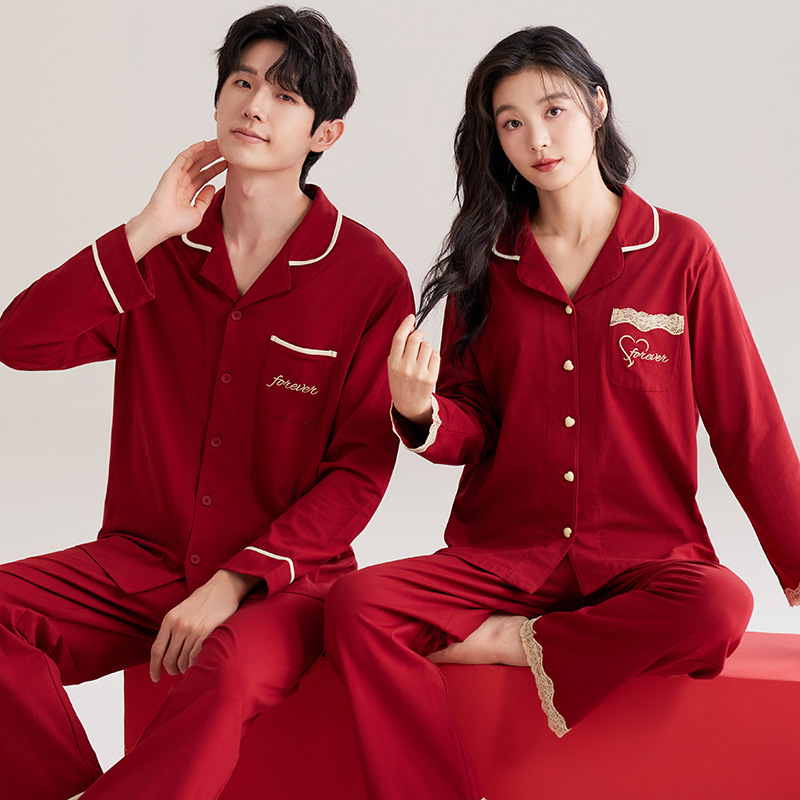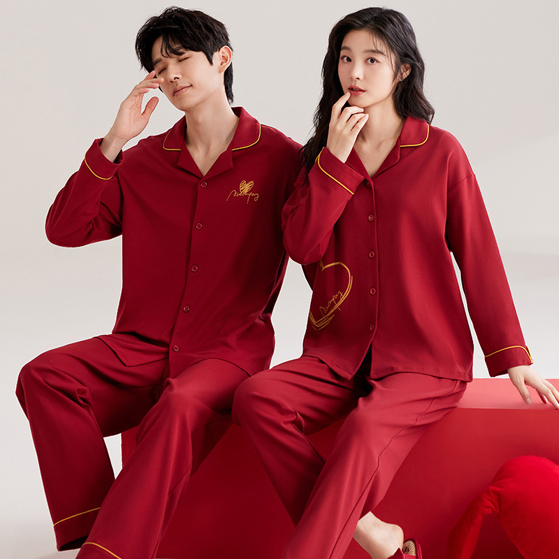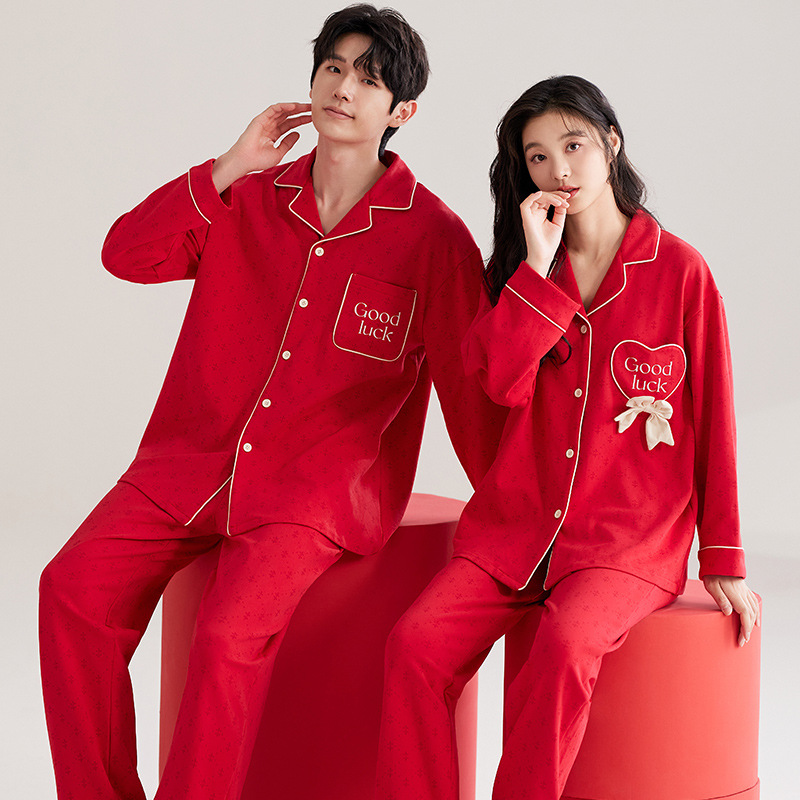 커플 웨딩 잠옷 봄, 가을, 겨울 순수 코튼 신혼 긴팔 빨간색 동물의 해 남성과 여성의 가정복 세트