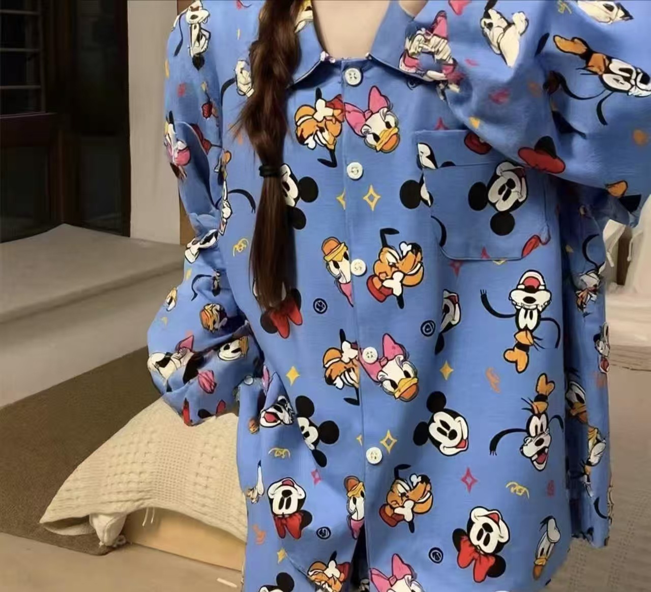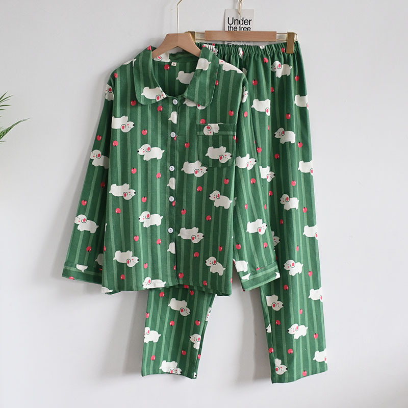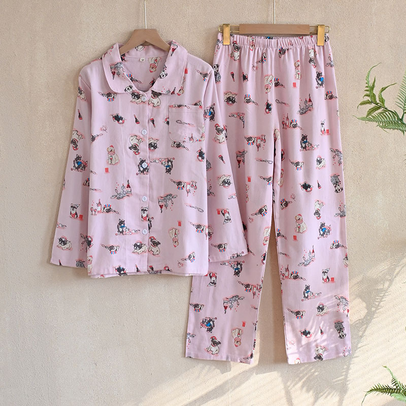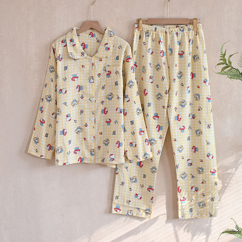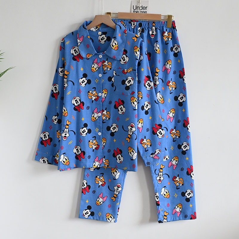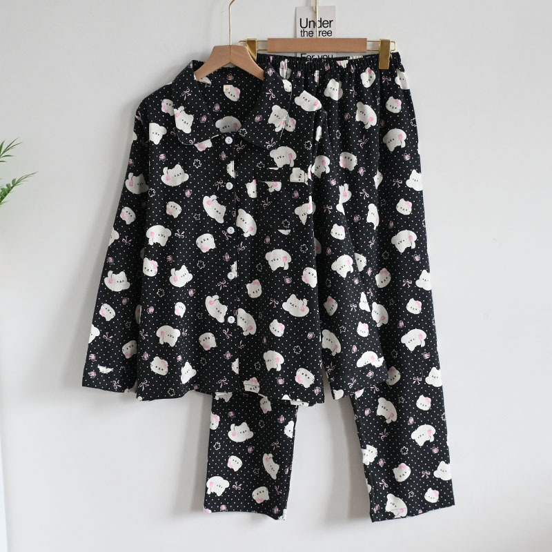 한국 스타일 여성용 잠옷 봄 가을 겨울 얇은 면 만화 캐릭터 카디건 긴팔 긴바지 라펠 면 기모 홈웨어 롱 스타일스토어 가기