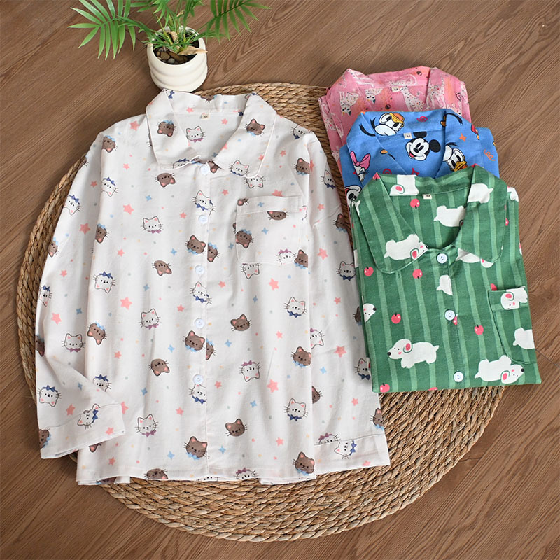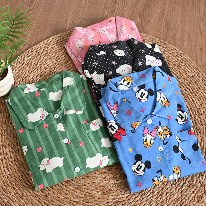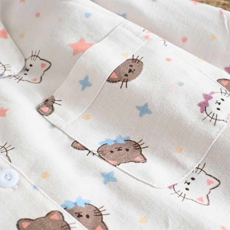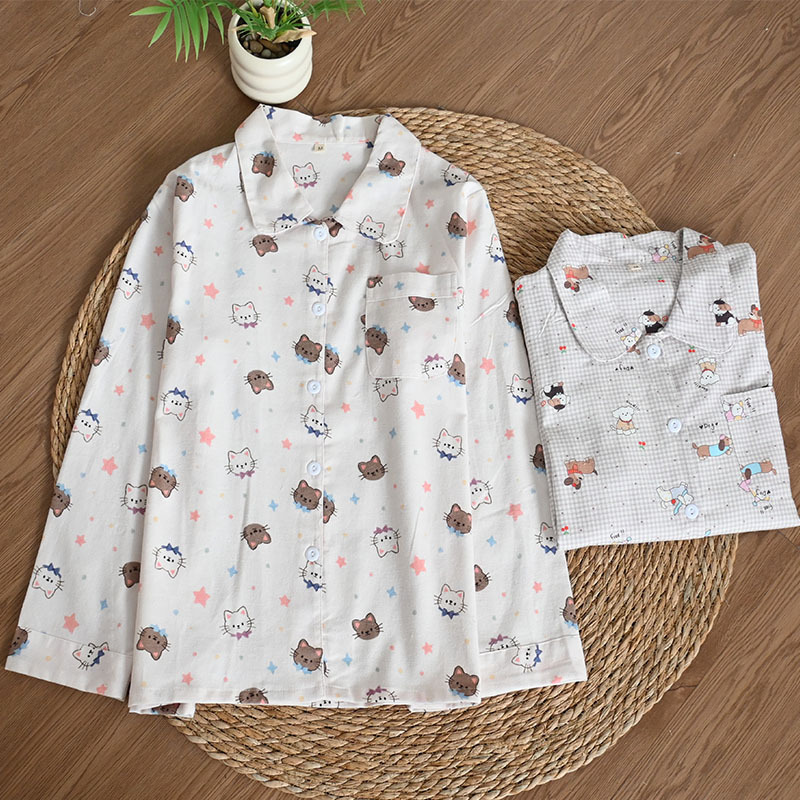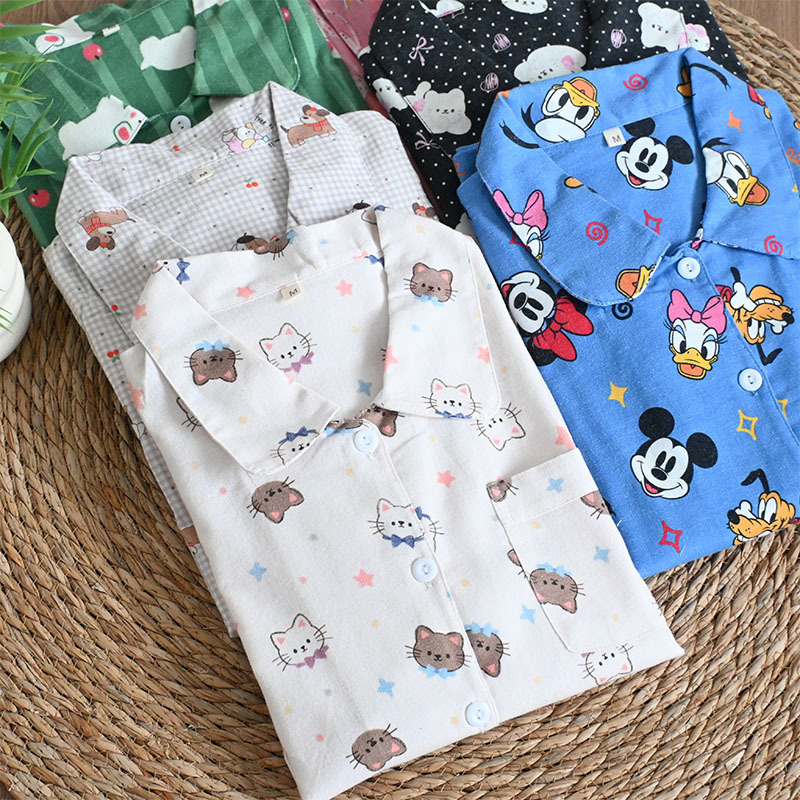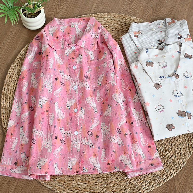 한국 스타일 여성용 잠옷 봄 가을 겨울 얇은 면 만화 캐릭터 카디건 긴팔 긴바지 라펠 면 기모 홈웨어 롱 스타일스토어 가기