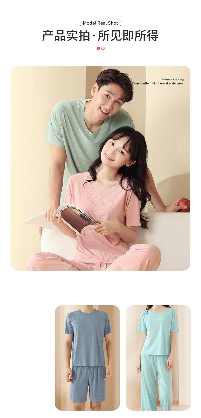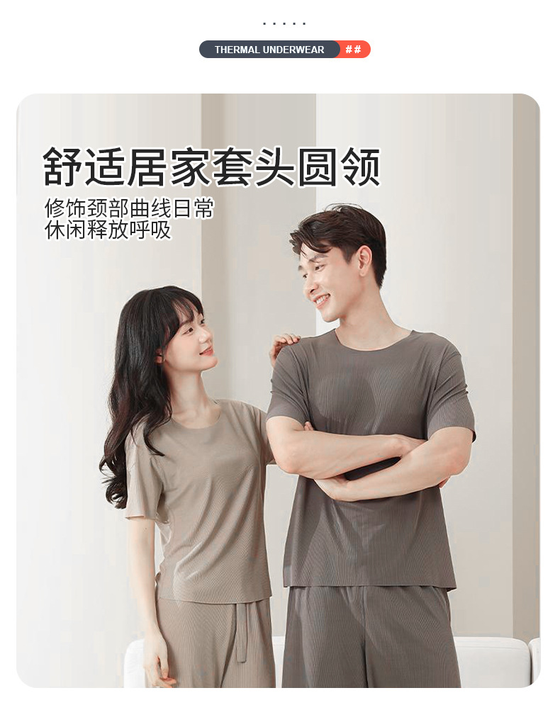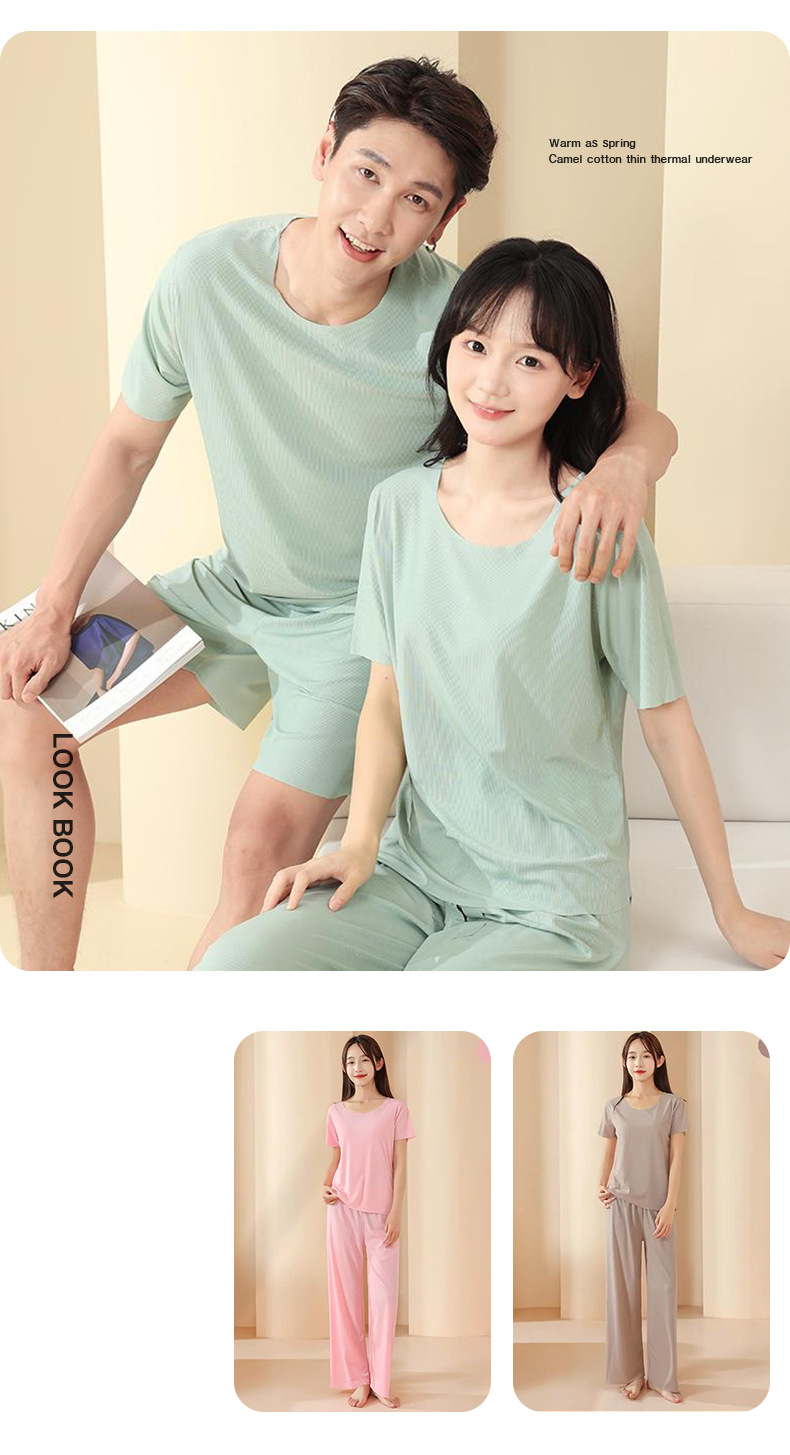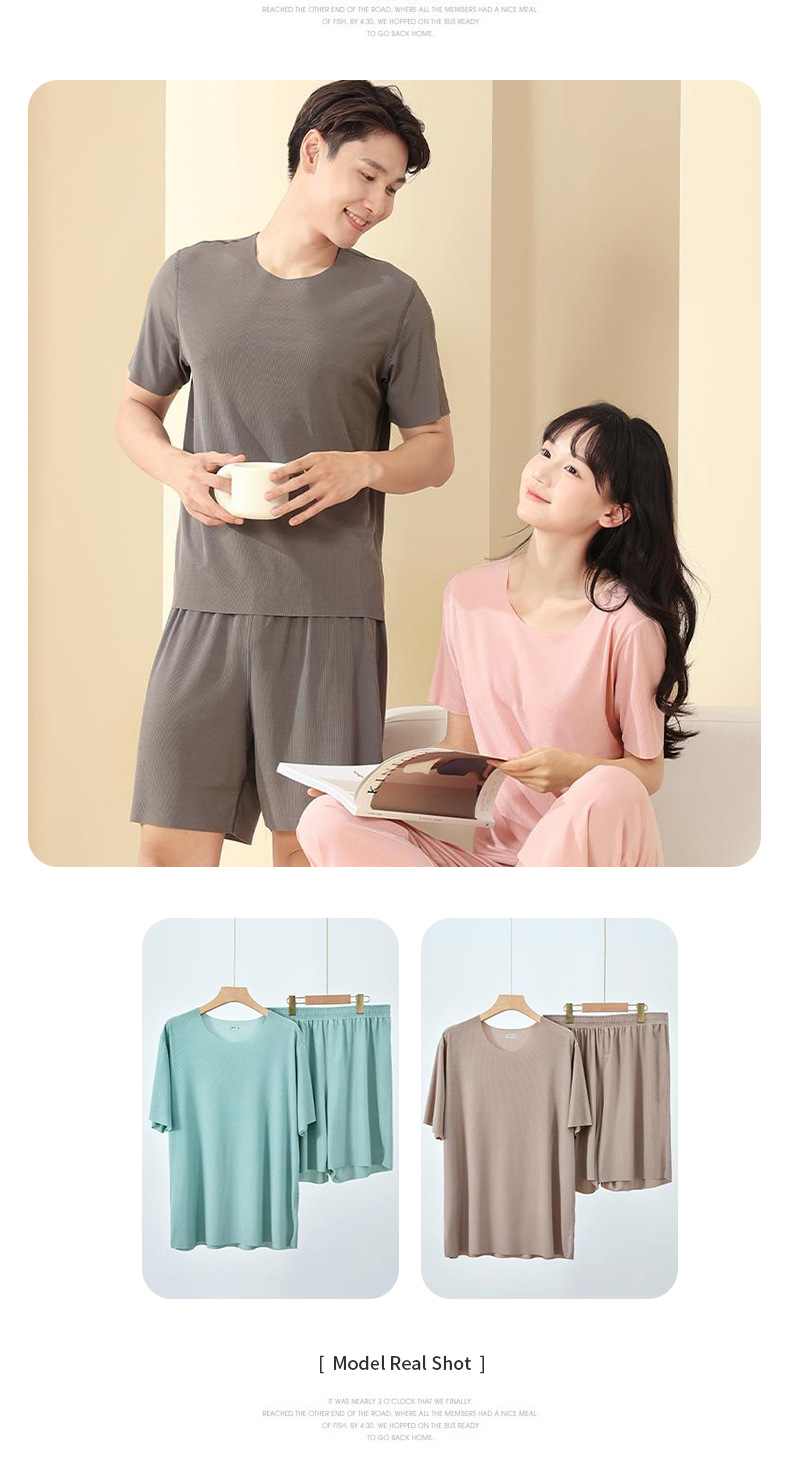 커플 얼음 실크 가정 의류 도매 여름 여성 라운드 넥 반팔 바지 정장 남성 반바지 얼음 실크 잠옷