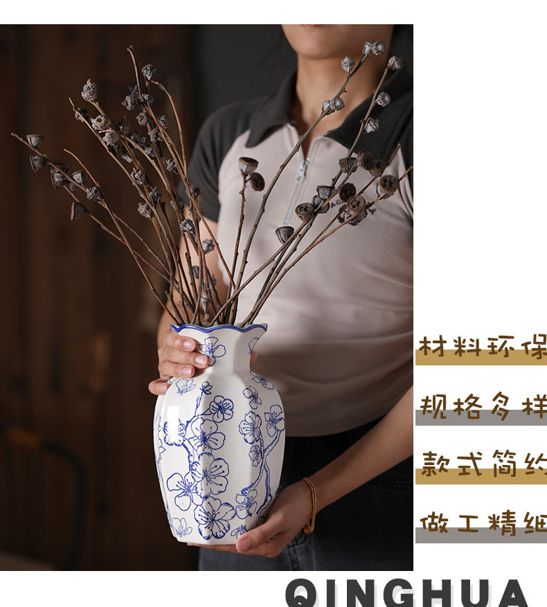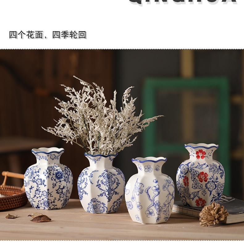 고급스러운 새로운 중국풍 복고 화분, 청화백자 도자기 꽃병, 창의적인 앤티크 수경재배 거실 꽃꽂이 장식품스토어 가기
