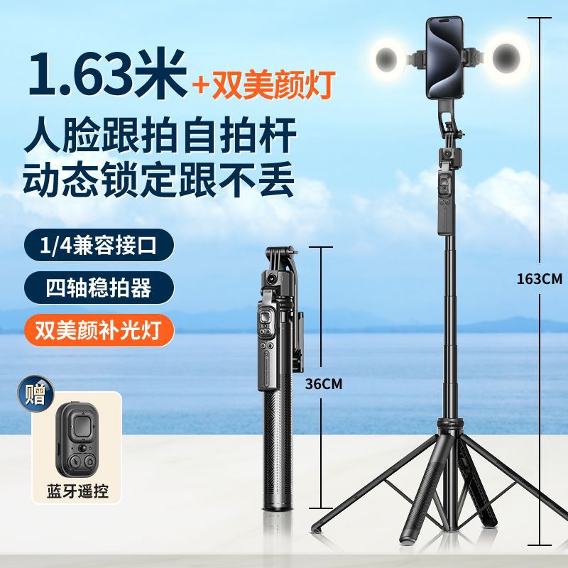 • [C17 블랙 1.63m ] 라운드 필라이트*2+사각다리+블루투스 리모컨+1/4커넥터 360°회전 클램프 + 지능형 추적 + 알루미늄 합금 막대