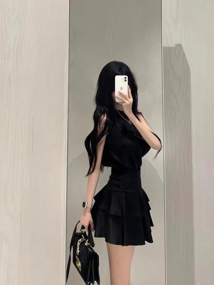 오프숄더 홀터넥 패셔너블 조끼 + 하이웨이스트 러플 퍼프 스커트 투피스 여름 슈트스토어 가기