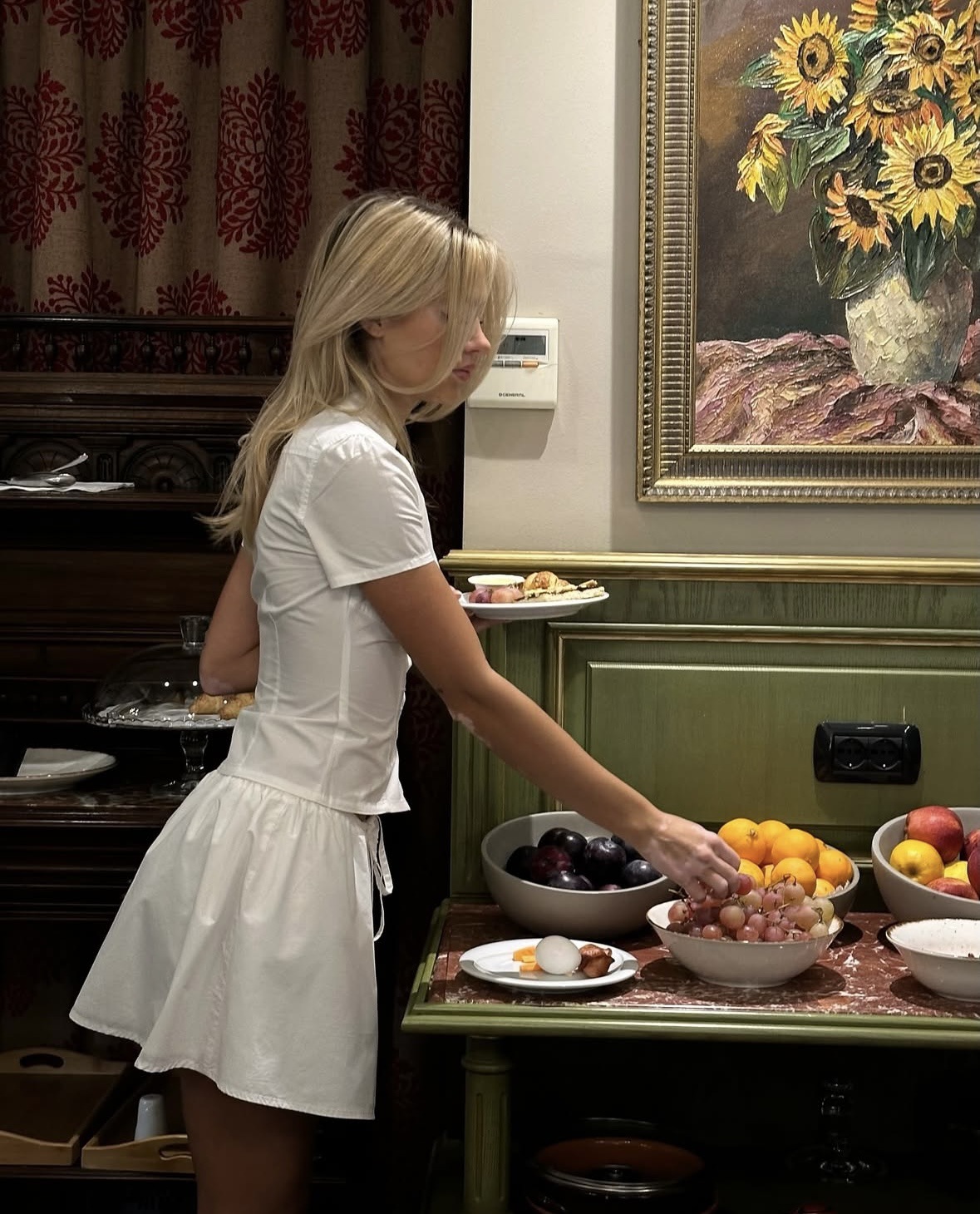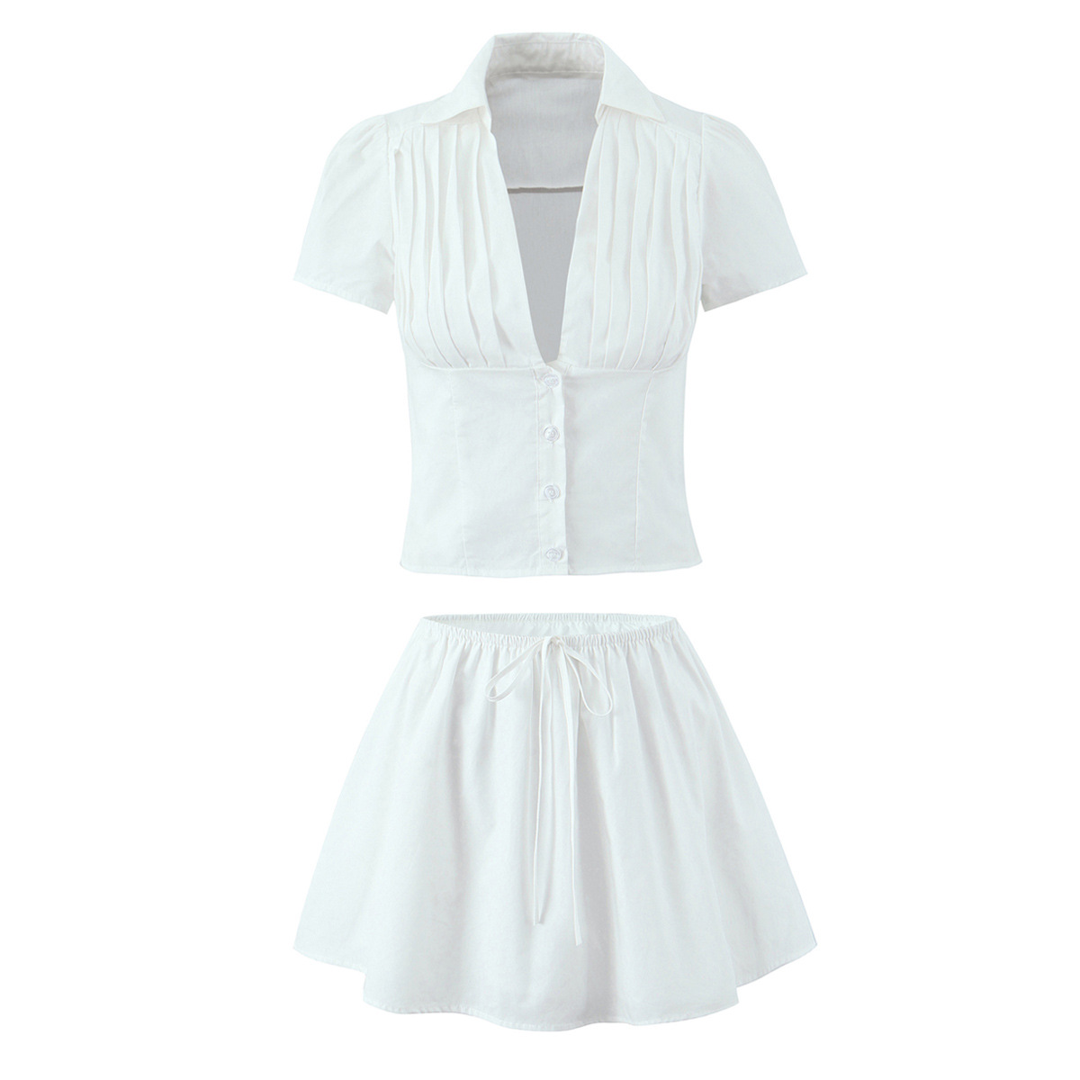 2025 AliExpress 유럽과 미국의 대학 스타일 달콤하고 매운 소녀 브레스트 탑 허리 짧은 소매 셔츠 여성 하이 웨이스트 A 라인 스커트