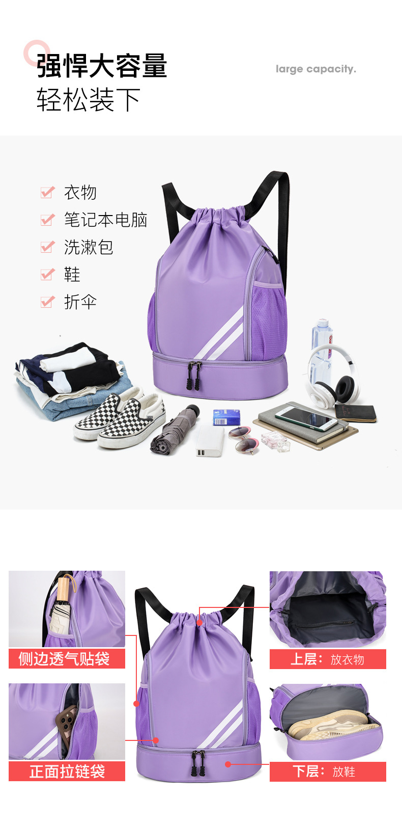 새로운 스타일의 조임끈 백팩, 캐주얼 여행가방, 대용량 접이식 백팩, 스포츠 농구가방, 여행용 신발가방
