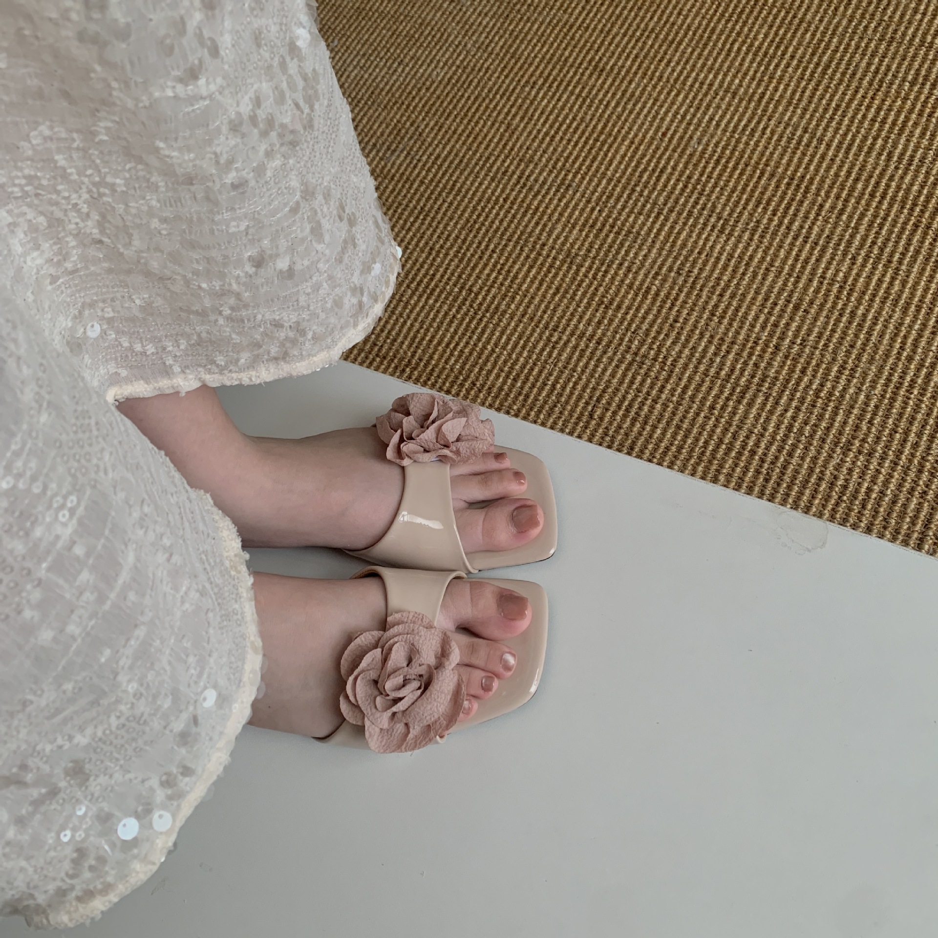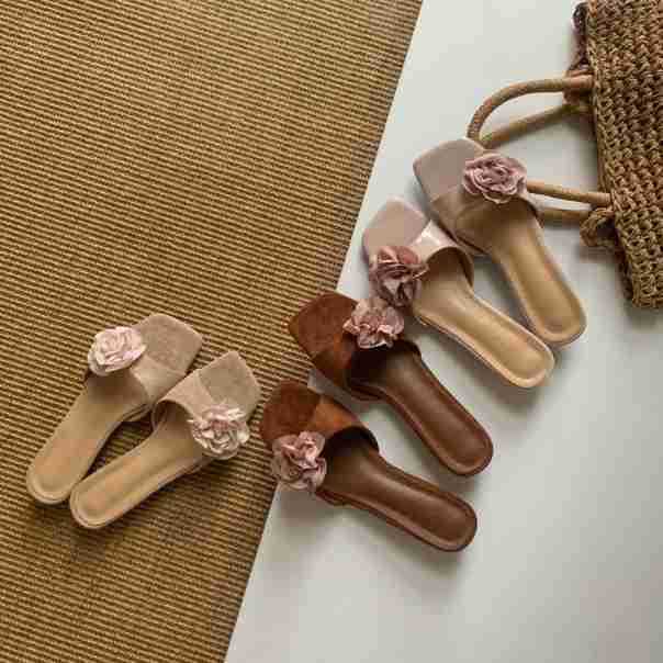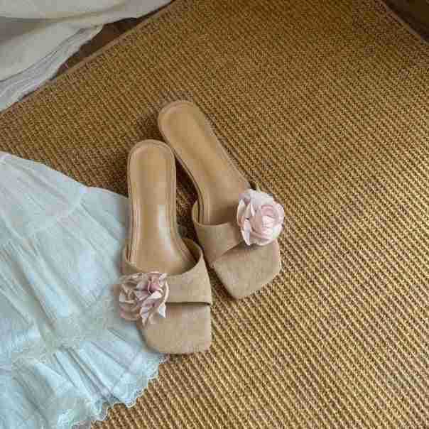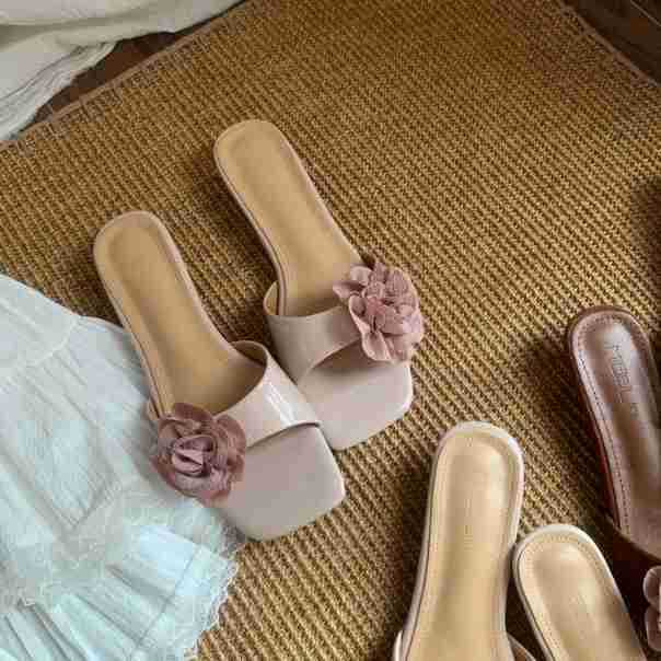 여름 아우터용 여성용 웨지힐 오픈토 슬리퍼 한국판 2025년 신상 꽃장식 프렌치 스퀘어토 샌들스토어 가기