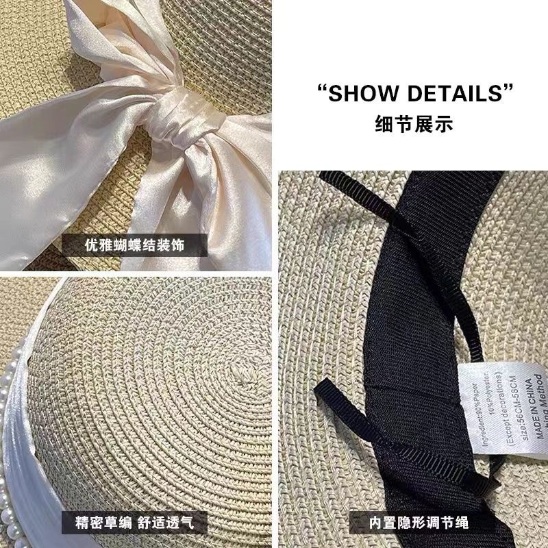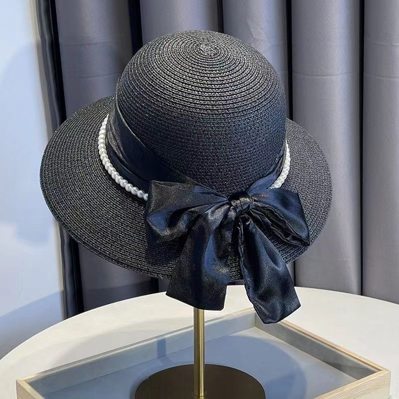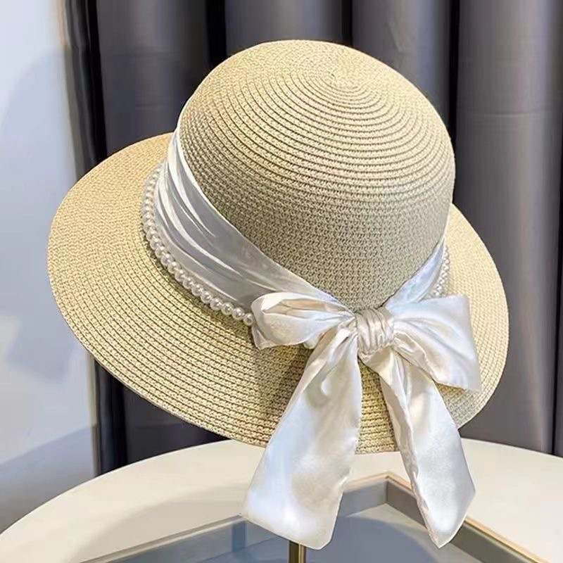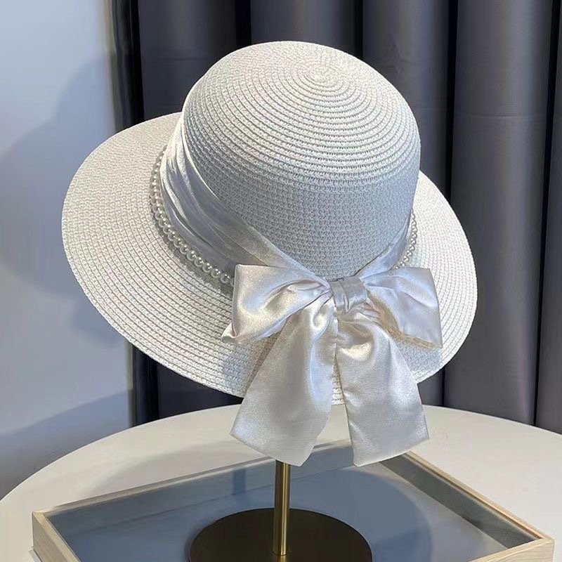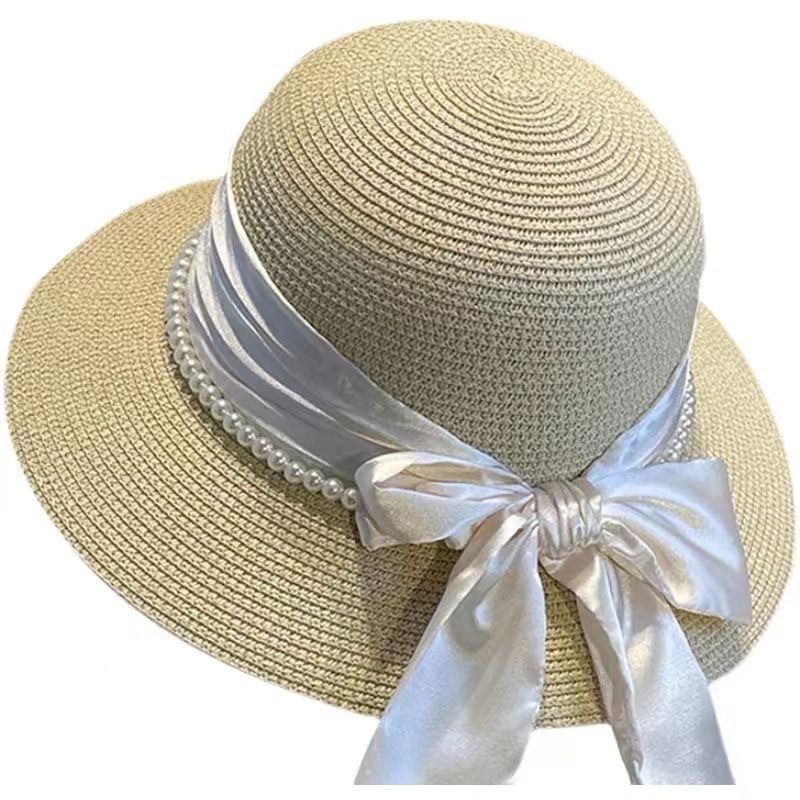 여름 돔 해변 여행을위한 여성용 프렌치 우아한 리본 보우 진주 밀짚 모자 새로운 다용도 모자 트렌드