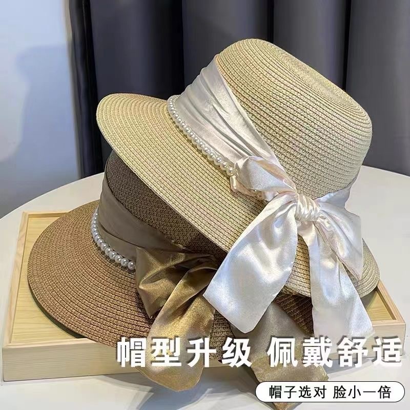 여름 돔 해변 여행을위한 여성용 프렌치 우아한 리본 보우 진주 밀짚 모자 새로운 다용도 모자 트렌드스토어 가기